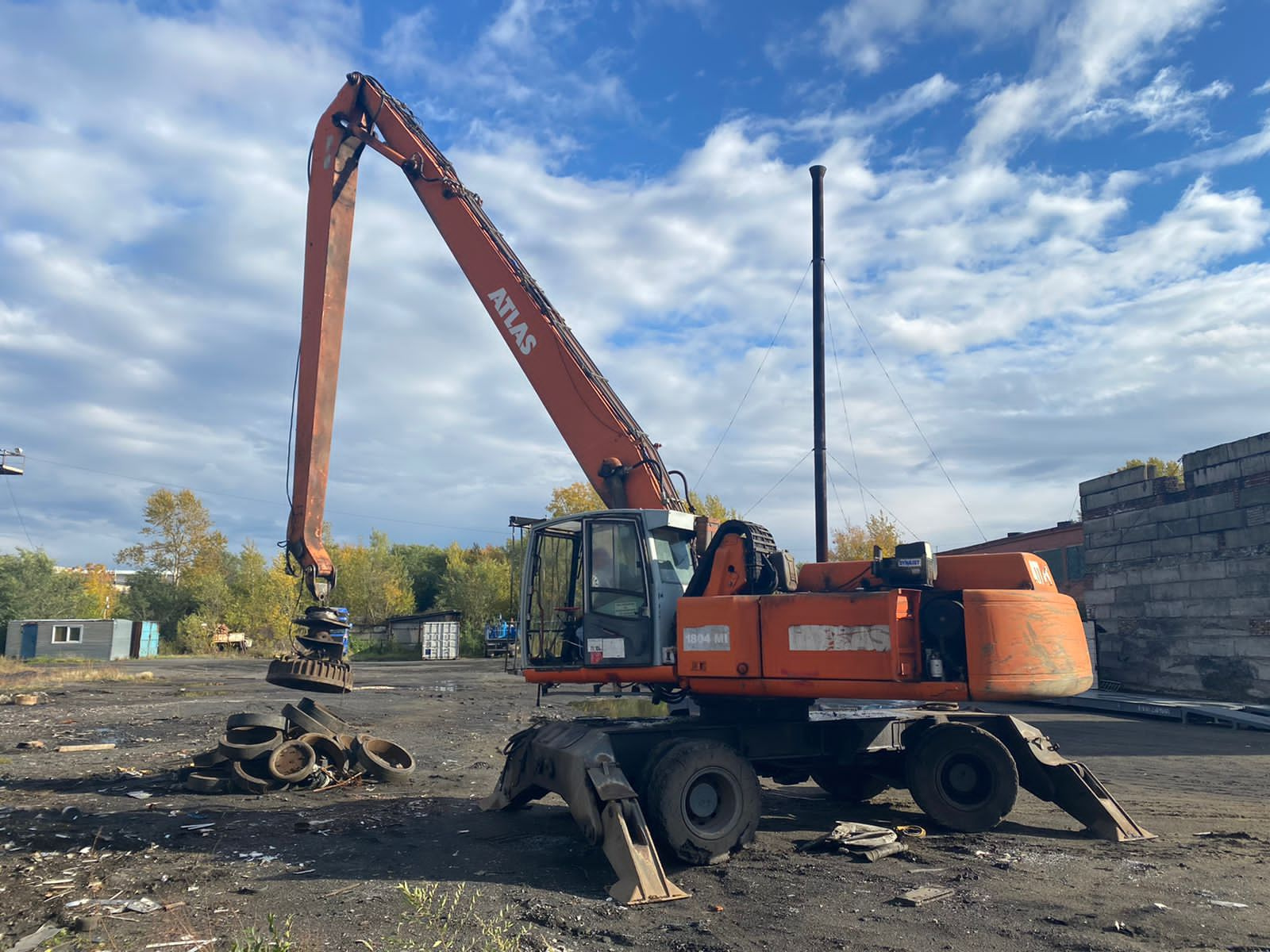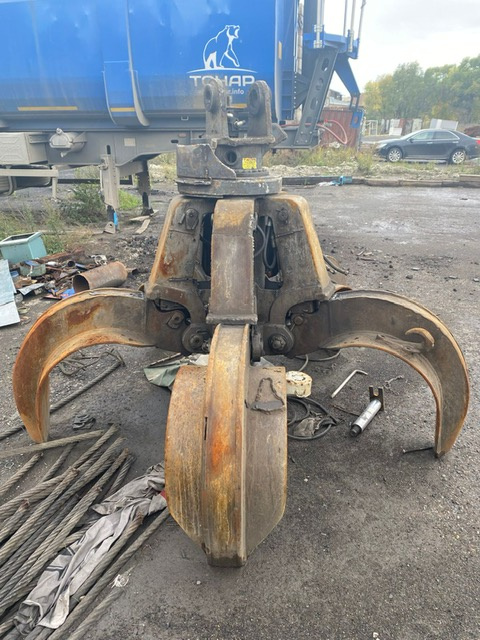 Перегружатель на колесном ходу для разгрузки, погрузки и перемещения лома и других материалов, в рабочем состоянии, в комплекте имеет съёмные магнитную шайбу и грейфер