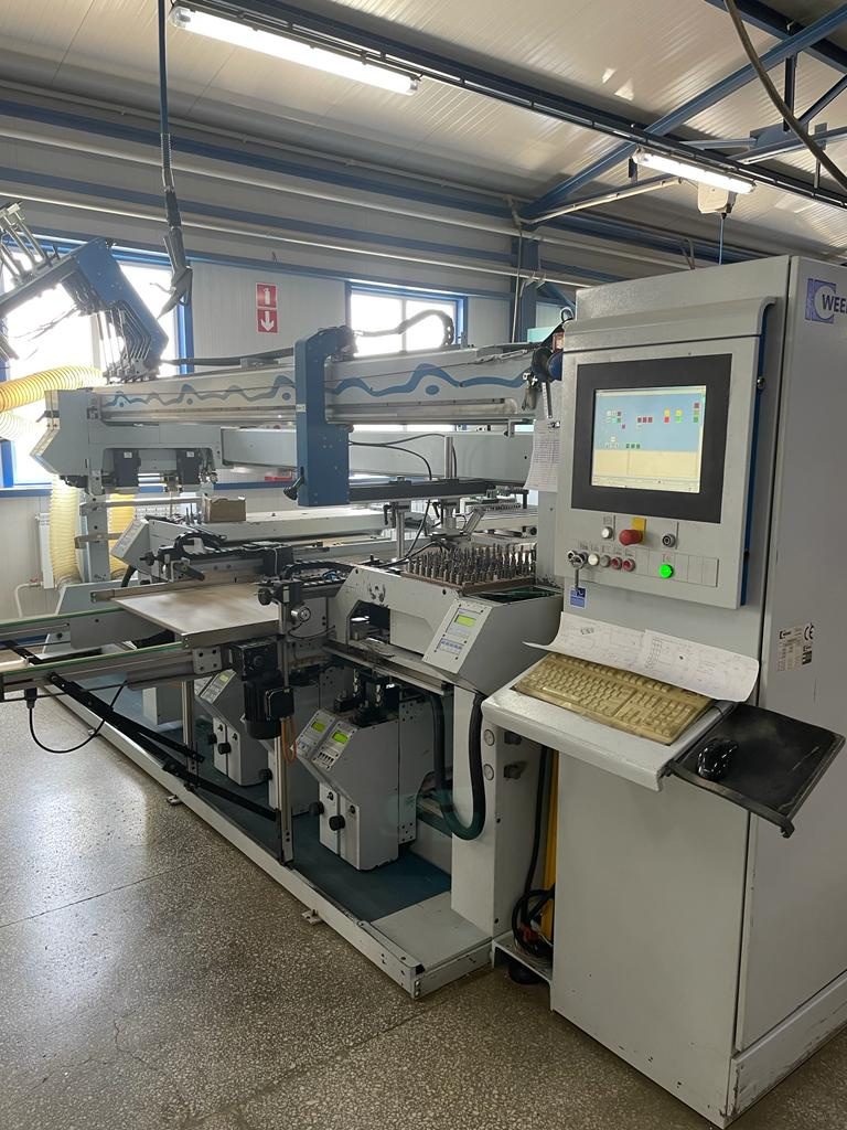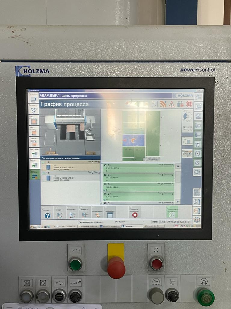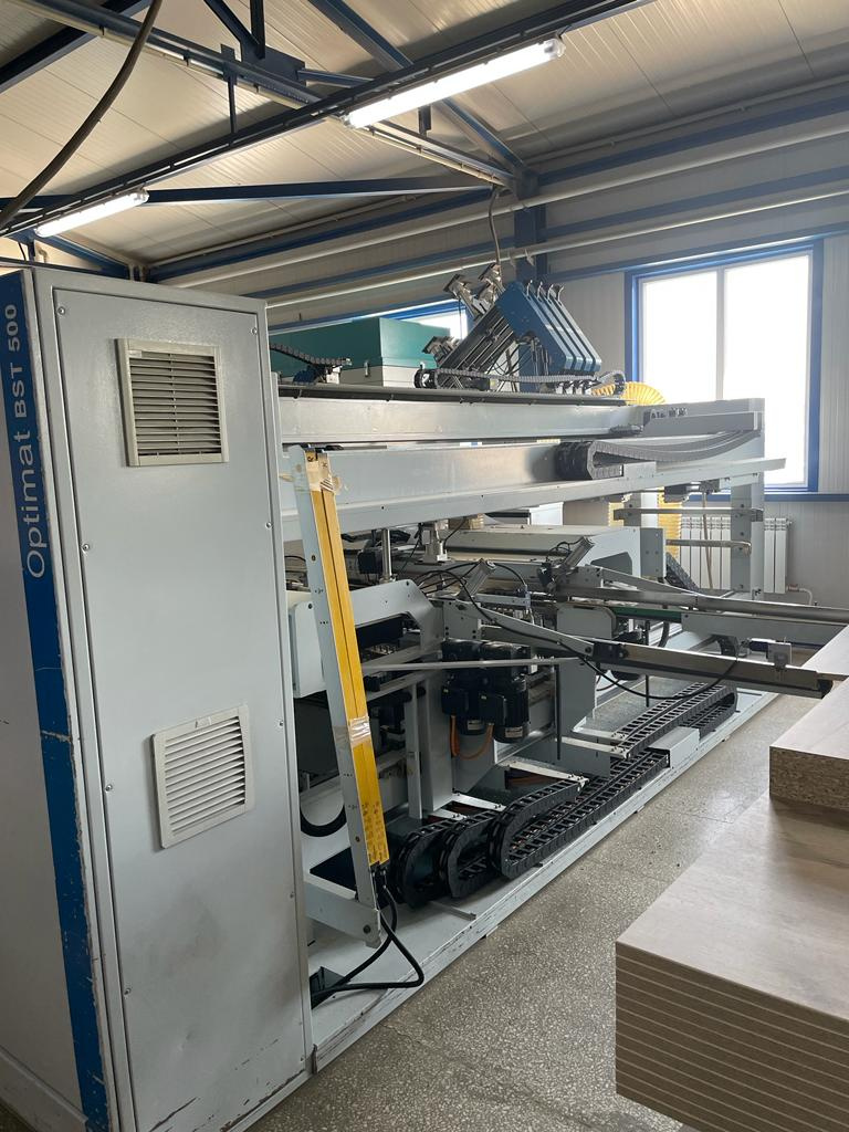 Автоматический станок для точного, бе;з сколов и вырывов, раскроя облицованных и необлицованных плит из древесных материалов, а также таких, которые обрабатываются аналогично древесным материалам. Пульт обслуживания и угловой упор справа.