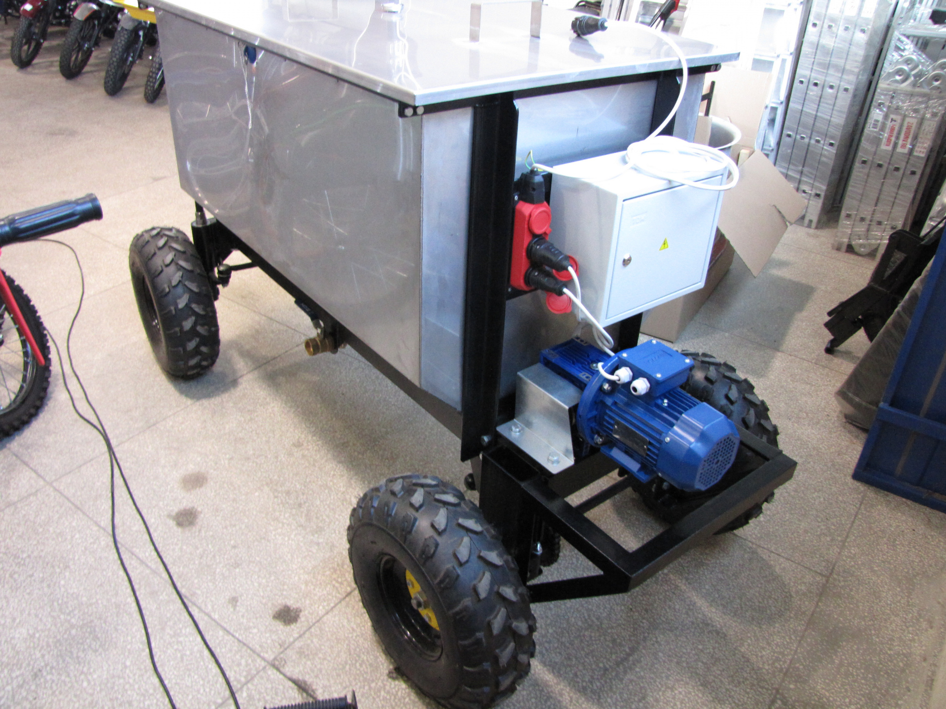 Колесная машина гаважа КМГ-600 предназначена для откорма уток мулардов в специализированых клетках гаважа. Емкость шпарчана 580 литров. Один оператор-гавер откармливает 200 уток в час.