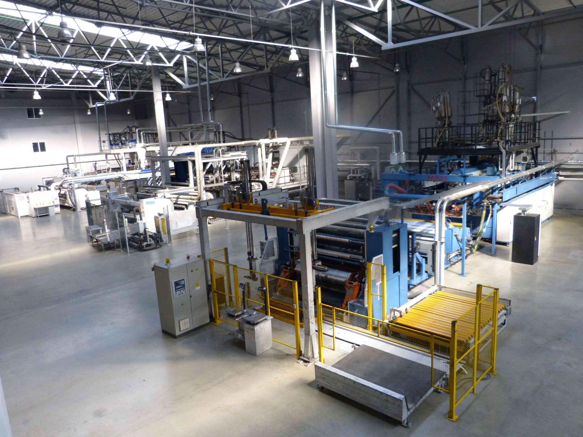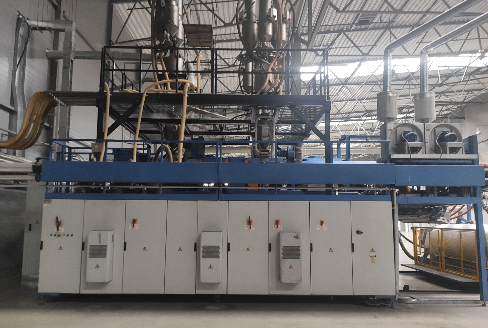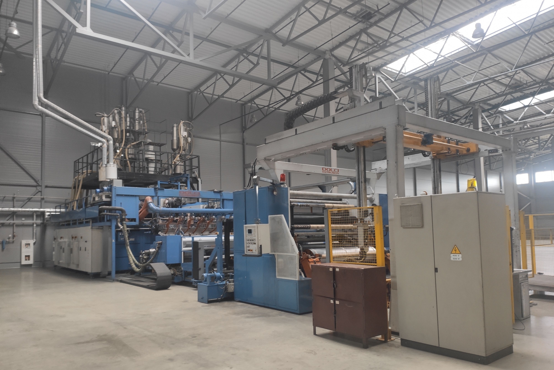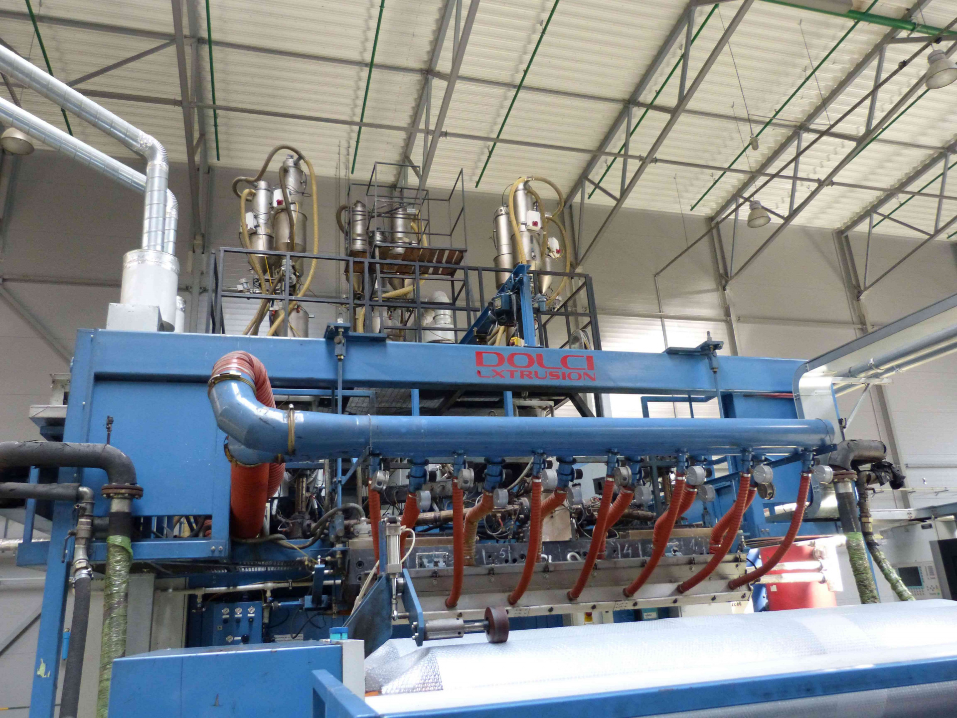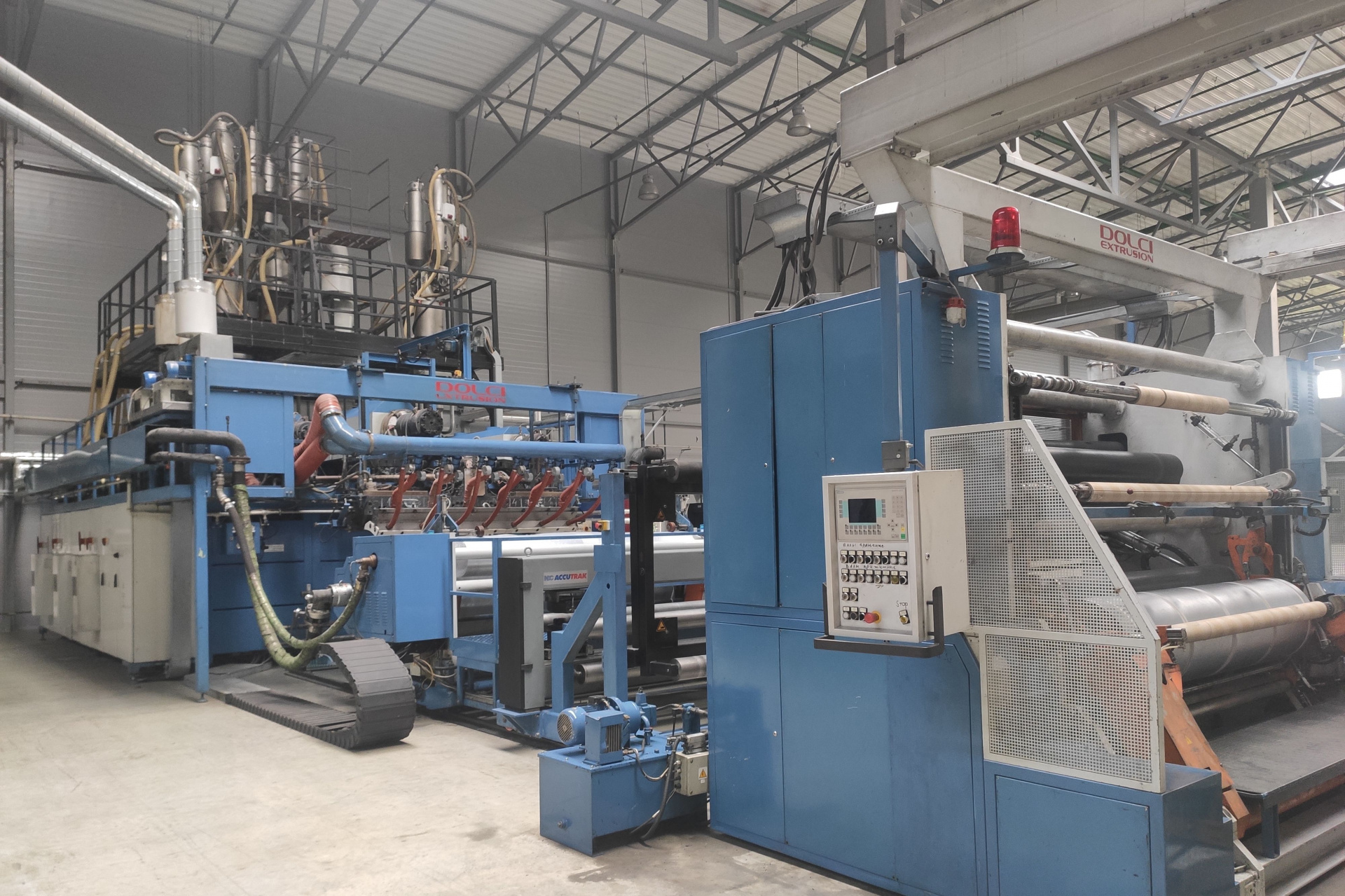 Состав линии: входят три экструдера, каждый из которых работает на один слой пленки. На каждом из экструдеров установлено по три дозатора Doteco, что позволяет в каждом слое смешивать до трех компонентов. На экструдерах установлены нагревательные элементы и охлаждающие вентиляторы, для поддержания заданной температуры.