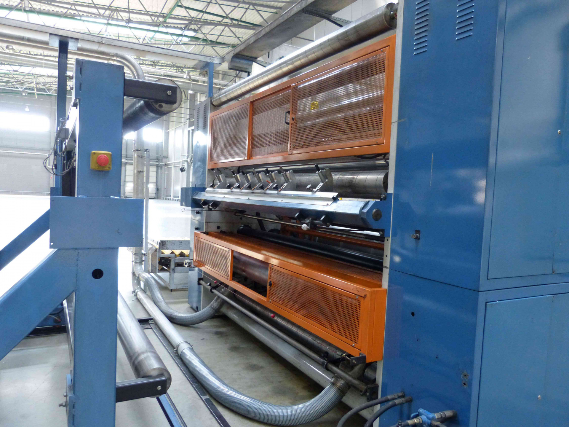 фидблок, где осуществляется формирование структуры пленки; - экструзионная голова с установленными на ней термоболтами; - узел охлаждения пленки, состоящий из двух охлаждающих барабанов (чилл-роллов); - система вакуумного прижима полотна к чилл-роллу; - устройства электростатического прижима кромок; - инфракрасная система измерения толщины выпускаемой пленки, связанная с термоболтами, установленными на экструзионной голове. Это позволяет автоматически регулировать толщину в процессе выпуска готовой продукции; - устройство осцилляции; - намотчика готовой продукции, на котором происходит резка полотна на необходимый размер и намотка в рулоны; - роботизированной системы замены рулонов.