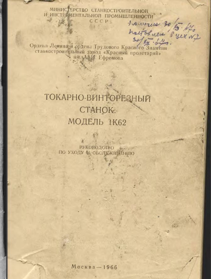 Токарно-винторезный станок модель 1К62. Руководство по уходу и обслуживанию в 2-х частях на 30 и 34 стр. Дополнительно общее описание и схема ремонта на 74 стр.