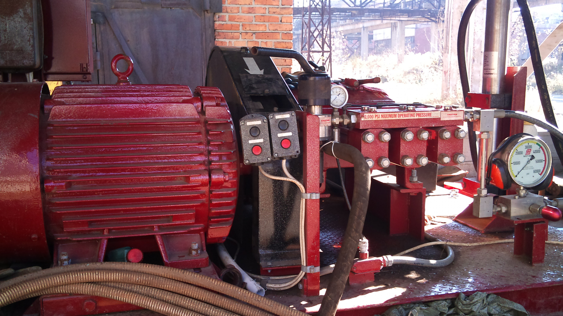 Гидродинамическая машина сверхвысокого давления. Привод электрический 380В мощность 75 квт, расход воды 15 литров в минуту, давление 2758 bar. Поменяется для очистки поверхностей от технологических загрязнений, окалины, ржавчины, старых покрытий, очистки теплообменников, внутренних поверхностей труб от d 150 мм.