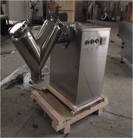 Миксер изготовлен из нержавеющей стали. Основная ёмкость, в которую засыпается порошок имеет форму V. От электрического двигателя вал приводиться в движение. Ёмкость начинает вращаться вокруг оси и порошок наилучшим способом начинает перемешиваться. После окончания перемешивания ёмкость отсоединяют или переворачивают вниз для выгрузки порошка. На ёмкости имеется крышка из нержавеющей стали, которая предотвращает образование пыли. Наилучшее компактное устройство для смешивания сухих сыпучих порошков.