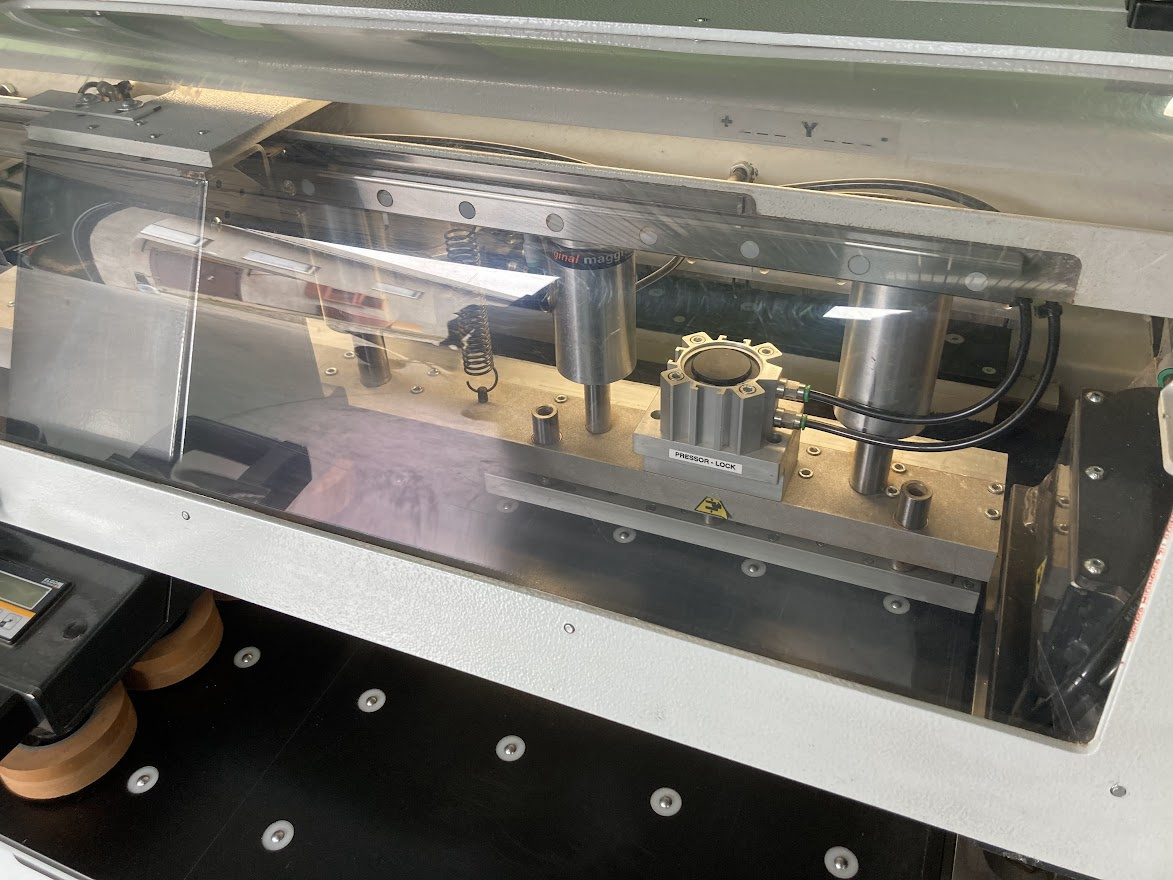 - по оси Y устанавливается вручную через пневматическую систему остановки прижимного блока, который фиксирует положение в соответствии с шириной панели.