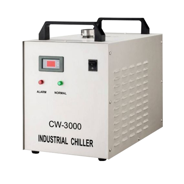 Чиллер CW-3000 используется взамен пассивной схемы охлаждения и для защиты лазерной трубки от перегрева. В корпус чиллера встроен герметичный водяной бак на 9 литров, охлаждение воды происходит за счет принудительного обдува. Для долговременной работы без перерывов на очистку и смену воды в чиллере, используйте дистиллированную воду.