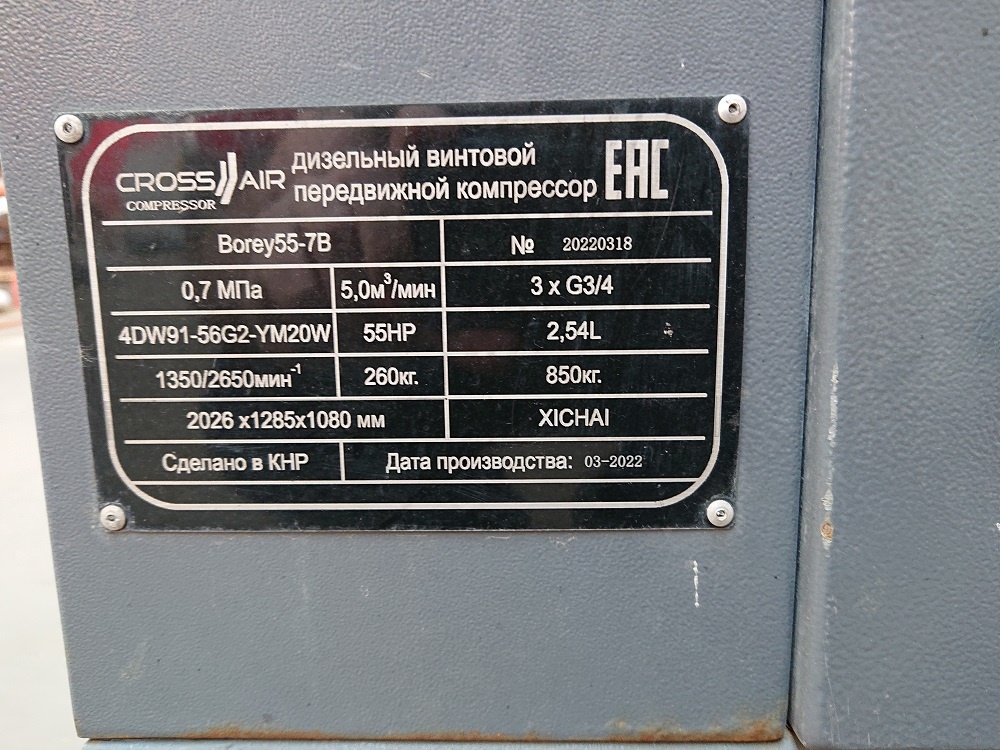 Дизельный передвижной компрессор Crossair Borey 55-7B. Компрессор в отличном состояние, наработка 1300м/час. Производительность 5000л/мин, давление 7бар