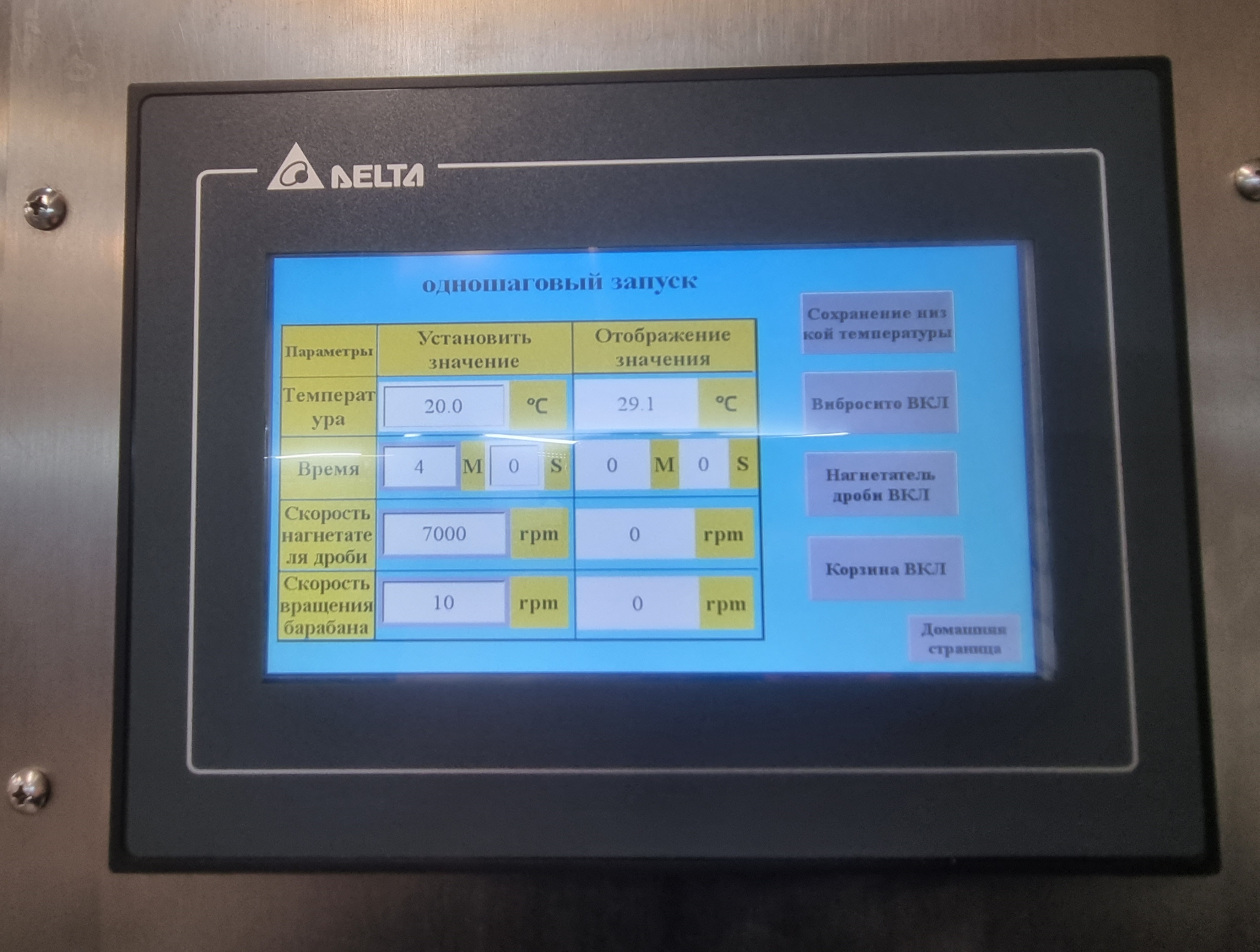Благодаря надежному PLC контроллеру «DELTA» возможно управление такими параметрами, как: температура, продолжительность цикла, скорость вращение корзины, скорость турбины-нагнетателя дроби, вибросито, создавать и сохранять программы под каждое изделие (память до 2000 программ).