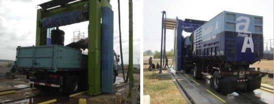 Грузовая автомойка портального типа имеет п-образную форму, осуществляет мойку неподвижного транспорта путем перемещения вдоль него по рельсам.