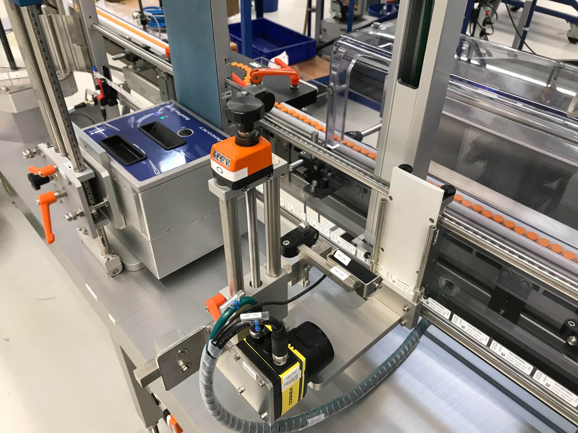 - Термотрансферный принтер Videojet DataFlex 6530 для печати срока годности/номера партии и т.п. на этикетках (до 3 строк по 18 буквенно-цифровых символов в каждой) с камерой печати и кодирования, и т.д.) с печатью с камеры и проверкой кода, датчики наличия этикеток с системой отбраковки. Флаконы выходят из машины под углом 90 гр и подаются непосредственно в упаковщик в картонные лотки.