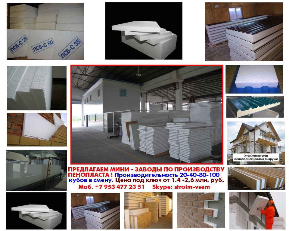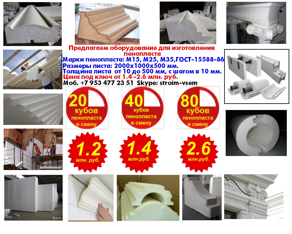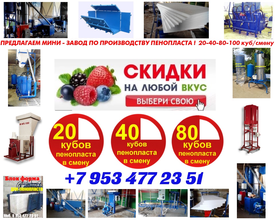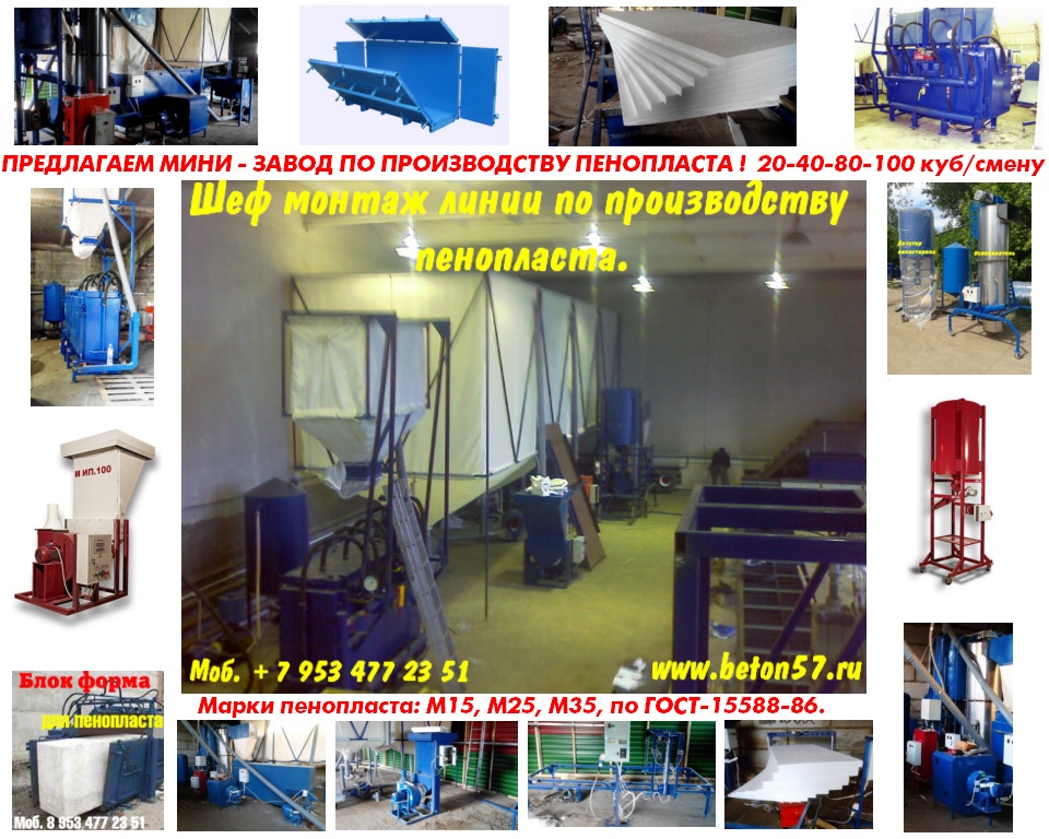 Предлагаем вам оборудование для производства пенополистирола. Все узлы и агрегаты мы испытываем на собственных, действующих производствах и поэтому можем гарантировать их надежность и работоспособность.Собственное производство и высококвалифицированный персонал позволяет изготавливать как типовое оборудование, так и не стандартное по вашему заказу.Полный рабочий цикл изготовления листового пенопласта, состоит из следующих этапов. Этап первый. Заготовка сырьяЭтап второй. Вспениваем гранулыЭтап третий. ВысушиваниеЭтап четвертый. ВылеживаниеЭтап пятый. Спекание пенопластаЭтап шестой. Резка 1. Мощность линии по производству пенополистирола - 20 кубов в смену. 2. Мощность линиипо производству пенополистирола - 40 кубов в смену. 3. Мощность линии по производству пенополистирола - 60 кубов в смену.4. Мощность линиипо производству пенополистирола - 80 кубов в смену.Вы получите марки пенопласта: М15, М25, М35, по ГОСТ-15588-86. Размеры наших блоков пенополистирола: 2050х1050х550 мм. Размеры наших листов пенополистирола: 2000х1000х500 мм. Толщина выпускаемого листового пенопласта от 10 до 500 мм, с шагом в 10 мм. По Вашему желанию, мы изготовим блок формы других размеров!Осуществляем: - шеф- монтаж оборудования для пенополистирола; - пусконаладкуоборудования для пенополистирола; - отработку технологии производства оборудования для пенополистирола. Мы, индивидуально подходим к каждому клиенту и предлагаем выгодные скидки, позволяющие обеспечивать вас отличной продукцией на тех условиях, которые выгодны вам. Видео работы оборудования по производству пенопласта https://www.youtube.com/watch?v=Wes_GdJSg48&t=3sЕсли купите это оборудование сегодня, то завтра вы забудете, что такое бедность...Звоните и пишите: на все обращения оперативно реагируют квалифицированные специалисты.Ответственность. Порядочность. Надежность во всем.