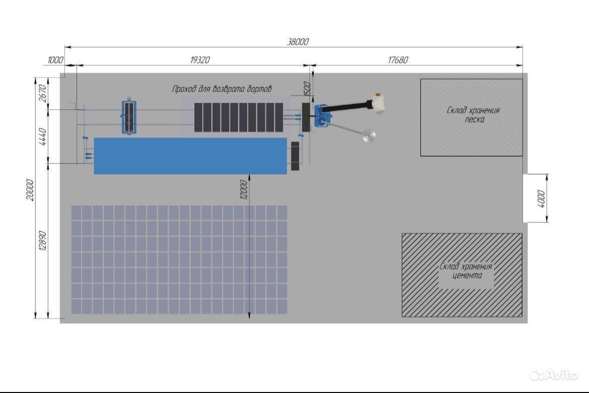 В комплект линии входит 34 утепленных поддонов и 12 утепленных бортов форм на 12 газоблока. Размер форм: 2,4 × 0,6 × 0,3 м.