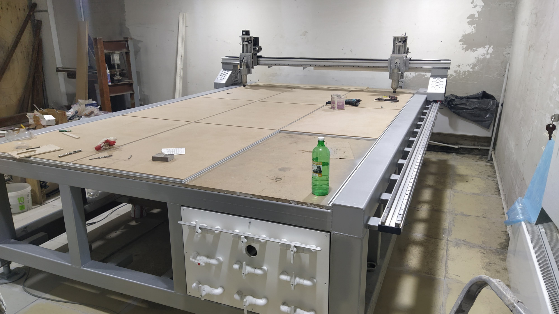 Комплектующие для сборки ЧПУ Фрезерного станка с рабочим полем 3500х2200мм.Фактически это собранный на 90%станок. Не хватает драйверов и блоков питания(20-30т.р) рама цельносварная ,разбирается на половину для транспортировки.Два шпинделя по 2,2 кВт с водяным охлаждением.Частотные преобразователи к ним.Направляющие hiwin 20mm.Зубчатые рейки.Система прижима приводов. Безлюфтовые ременные редуктора.Двигатели Nemo86 12H .Портальная алюминиевая балка по оси X. Вакуумный вихревой насос 7,5 кВт. Панель управления зонами вакуумирования.В общем всё подогнано и установлено смотри на фото. Цена за всё. По сборке и настройке помогу.