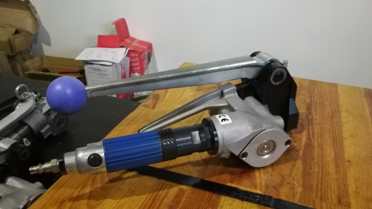 Комбинированное устройство для обвязки стальной лентой, натяжка происходит от компрессора, скрепление -просечка(в ручную). Лента шириной16-19, толщина 0,6.мм.