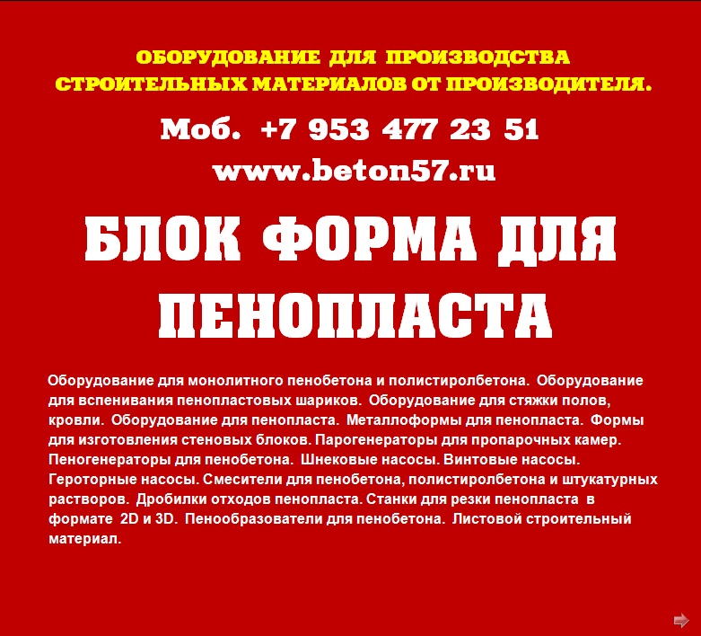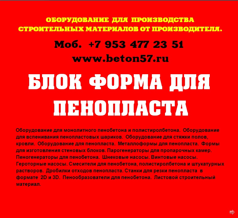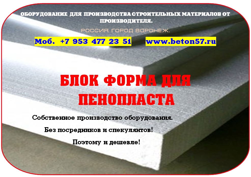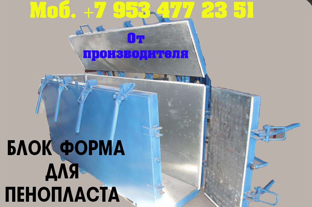 Предлагаем блок форму для пенопласта.Своя собственная производственная база, позволяет нам на протяжении многих лет,производить оборудование собственных разработок.Производительность 8 кубов пенопласта в час! Размеры блоков пенополистирола: 2050х1050х550 мм. Размеры листов пенополистирола: 2000х1000х500 мм.Блок форма для пенопласта.Производительность блок формы для изготовления пенопласта 7-8 кубов в час.Вы получите марки пенопласта: М15, М25, М35, по ГОСТ-15588-86. Размеры наших блоков пенополистирола: 2050х1050х550 мм. Размеры наших листов пенополистирола: 2000х1000х500 мм. Толщина выпускаемого листового пенопласта от 10 до 500 мм, с шагом в 10 мм.По Вашему желанию, мы легко изготовим блок формы, других размеров! Не проблема, так как мы сами изготавливаем, любые блок формы!Осуществляем: - шеф- монтаж оборудования; - пусконаладку; - отработку технологии производства. В блок форме осуществляется формовка блоков пенопласта. Формовка блока пенопласта происходит под действием водяного пара. Нагреваясь, гранулы ПСВ ( EPS) начинают увеличиваться в объеме. Так, как блок форма представляет собой замкнутую конструкцию, шарики ПСВ-с начинают спекаться между собой. Блок форма, представляет собой каркас из стального металла. Внутри, каркас обшит перфорированным специальным металлическим листом - 7 мм. Снаружи, каркас обшивается обычным железом 3мм, без перфорации. Применение специального железа, позволяет сократить до нуля эффект прилипания готового пенопласта к стенкам формы.Блок форма, оснащена системой слива конденсата. Пар в блок форму, для производства пенополистирола ( пенопласта), подается через специальные отверстия в стенках формы. Подача пара осуществляется со всех сторон одновременно.По всему периметру, имеется уплотнительный силиконовый шнур. Шнур является расходным материалом. Нормальный срок службы уплотнения 3 месяца при максимальной загрузке блок формы.У нас выгодно покупать выгодно покупать, потому что: Профессиональные консультации при покупке в компании.Оборудование всегда в наличии. Разумные цены. Надежность, проверенная временем. Нет проблем с запчастями, потому как мы сами изготавливаем оборудование. Любая форма оплаты. Есть вопросы? Напишите нам – будем рады ответить. Или позвоните нам – мы с удовольствием ответим на все ваши вопросы. Поставка по России и СНГ !Ответственность. Порядочность. Надежность во всем! Подробная информация, на сайте нашей фирмы.Вы бедны и не можете открыть свое производство? Бедность - это удобно. Не надо шевелиться, не надо развиваться, не надо напрягаться. Проще сказать - я бедный, у меня никогда ничего не будет. Еще хуже - напрягаться годами за копейки, когда можно напрячься один раз, - взять кредит, купить оборудование, открыть свое дело и выскочить хотя бы в средний класс. Обдумайте это! Есть вопросы? Напишите нам – будем рады ответить. Контактное лицо: Владимир Петрович.