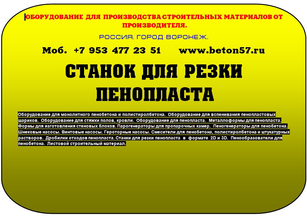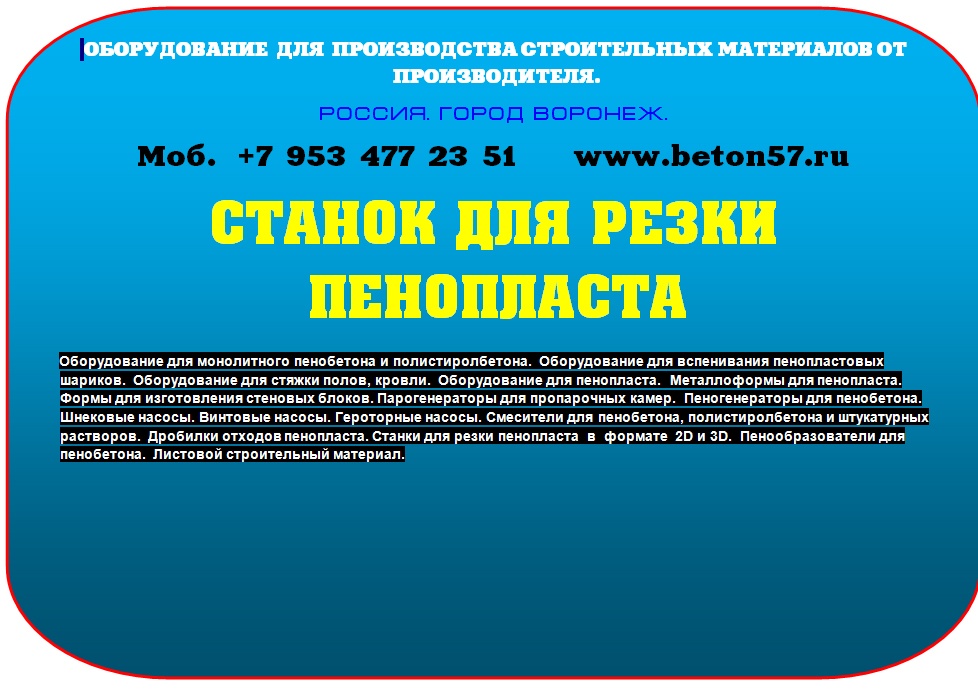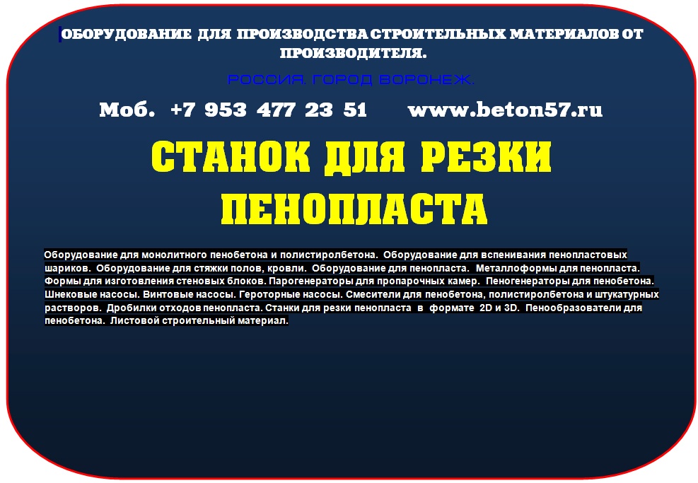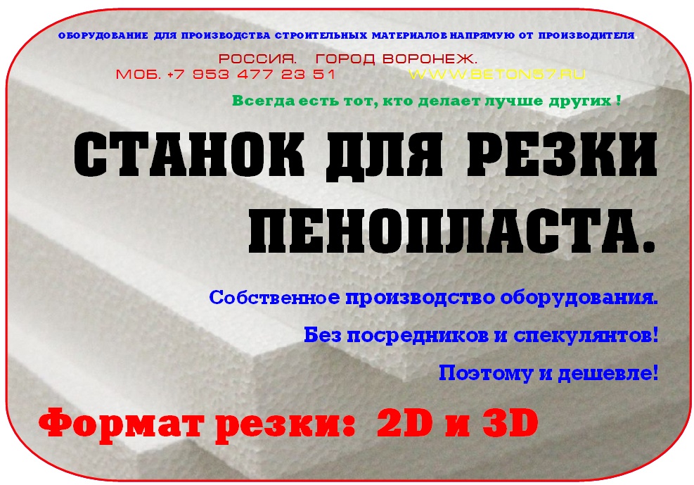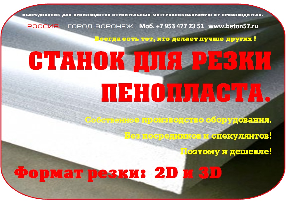 Предлагаем Вам станок для резки пенопласта.Мы сами производим все необходимое оборудование, мы не являемся посредниками, ничего не перепродаем. Производим полуавтоматические и автоматические и ручные станки раскроя пенопласта. Великолепное качество реза в 2D и в 3D формате.На станке резки пенопласта, можно обрабатывать вспененный пенополистирол (ГОСТ 15588-2014) пенопласт любой плотности.Цены на станки для резки пенопласта от 95.000 руб. до 140.000 руб.Станки раскроя блоков пенопласта на листы имеют:- ручное управление- полуавтоматическое управление- автоматическое управлениеНе можете определиться? Спросите совета у наших специалистов!Менеджер c удовольствием ответит вам прямо сейчас.У нас выгодно покупать, потому что: 1.Оборудование поставляется напрямую от производителя.2. Оборудование всегда в наличии.3. Разумные цены4. Надежность, проверенная временем5. Наше оборудование установлено более чем на 320 объектах страны6. Нет проблем с запчастями, потому как мы сами изготавливаем оборудование7. Любая форма оплаты.Продажи напрямую от производителя. Доступные цены для наших покупателей. Профессиональные консультации при покупке в компании. Опыт изготовления 17 лет! Для снижения цен разработана программа прямых поставок от производителя. Вас удивит доступность цен. Надежность и порядочность, проверенная временем. У вас есть вопросы? Менеджер c удовольствием ответит вам прямо сейчас!Контактное лицо: Владимир Петрович.Город Воронеж.