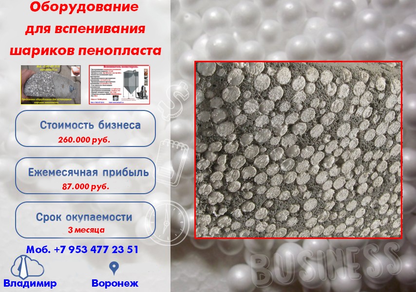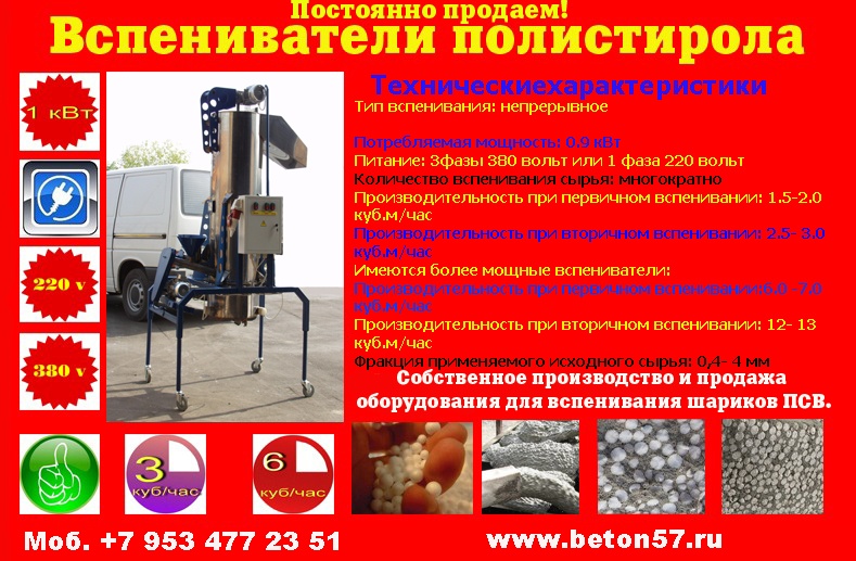 Пенополистиролбетон.Предлагаем предвспениватель шариков полистирола.Разновидности пенополистирольных (или пенопластовых) гранул отличаются по физико-механическим показателям.Благодаря многим специфическим свойствам этот материал широко используются в промышленности. Утепление пенопластовой крошкой считается самым надежным холодостойким методом термоизоляции полов, стен или кровель. Кроме того ее добавляют в строительные смеси и растворы с целью облегчения и утепления. Находит гранулированный пенопласт применение как наполнитель для мягкой мебели или детских игрушек; в качестве насыпного упаковочного материала; в производстве полистиролбетона и как фильтрующий компонент при очистке воды. Пенопластовая крошка - так принято называть в народе шарики пенополистирола.Шарики пенополистирола применяют: в утеплении плит фундамента и стен; при производстве полистиролбетона; в виде амортизирующей подстилки; для устройства кровельных покрытий с плоским уклоном; для смесей с бетоном или цементом с пенопластовой крошкой; для термоизоляции траншейных труб; для изготовления цементно-песчаной стяжки; как лучший засыпной материал для стен с воздушной прослойкой.Шарики фасуются в полиэтиленовые мешки по 0,5 и по 1м3. Важными показателями долговечности службы пенополистирола являются:соответствующие стандартам размеры - диаметр гранулы должен быть от 1 до 8мм, а предельные отклонения в линейных размерах должны быть менее 0,5мм;- плотность покрытия заполняемого пространства (от 8 до 30кг/м3);- правильная геометрическая форма и цвет (сферические белые шарики);- прочность при сдавливании с низкой вероятностью деформации (0,005 - 0,026 кг/см2);- низкая теплопроводность сухих гранул при температуре 25°С (0,053 - 0,036 Вт/мxК).Утепление пенопластовой крошкой считается самым надежным холодостойким методом термоизоляции полов, стен или кровель. - звукоизоляция (гранулы имеют шероховатую поверхность, которая плохо проводит звуковые колебания);- теплоизоляция (полное заполнение мелкими гранулами воздушной подушки в утепляемом месте убирает любые мостики холода);- амортизационные способности (при сдавливании шарики не теряют структуру и быстро принимают прежнюю форму);- простота работы и транспортировки (имеет малый вес и максимально заполняет необходимое пространство); - эксплуатационные качества (рабочий диапазон температур от -190°C до +87°C);- не имеет запаха и не вызывает аллергических реакций;- влагостойкость (отсутствие абсорбирующих свойств);- экономичность (относительно низкие цены на изделие и возможность снижения цен на другие материалы благодаря смешиванию растворов с пенопластовой крошкой).- экологичность (материал нетоксичен и безопасен для людей);Кроме того ее добавляют в строительные смеси и растворы с целью облегчения и утепления.