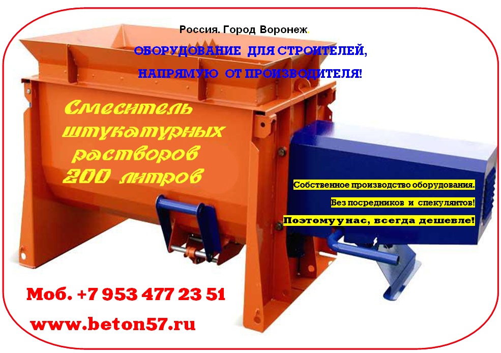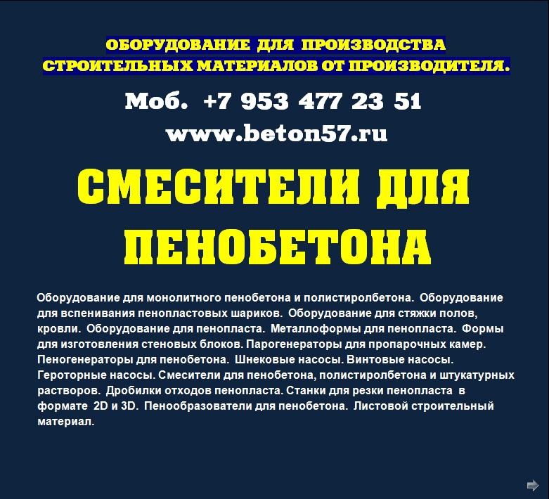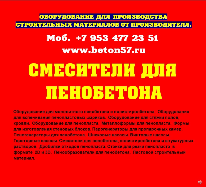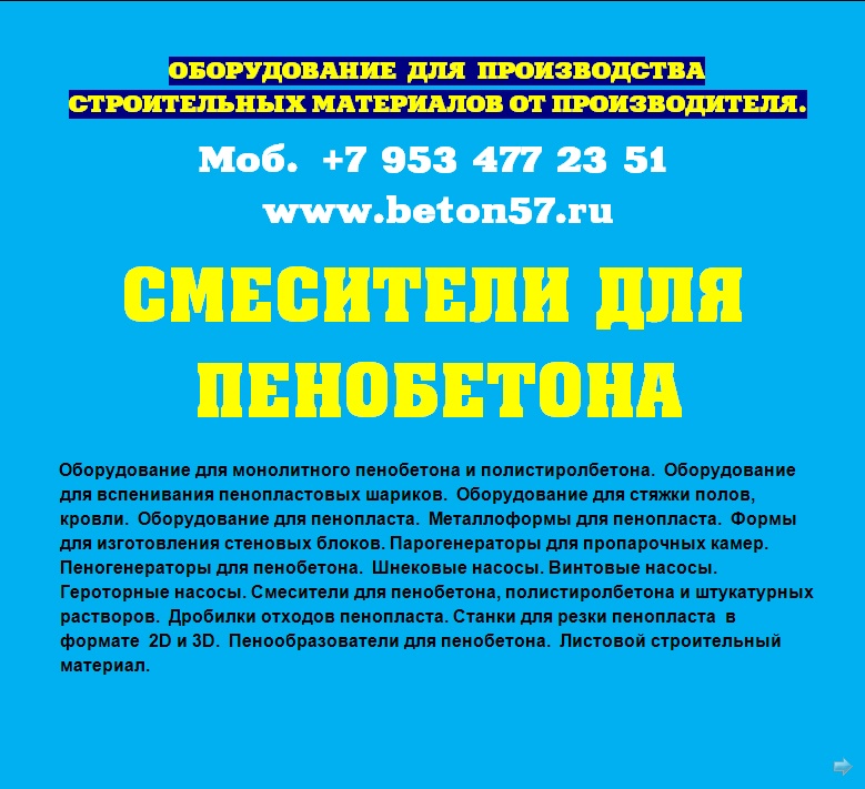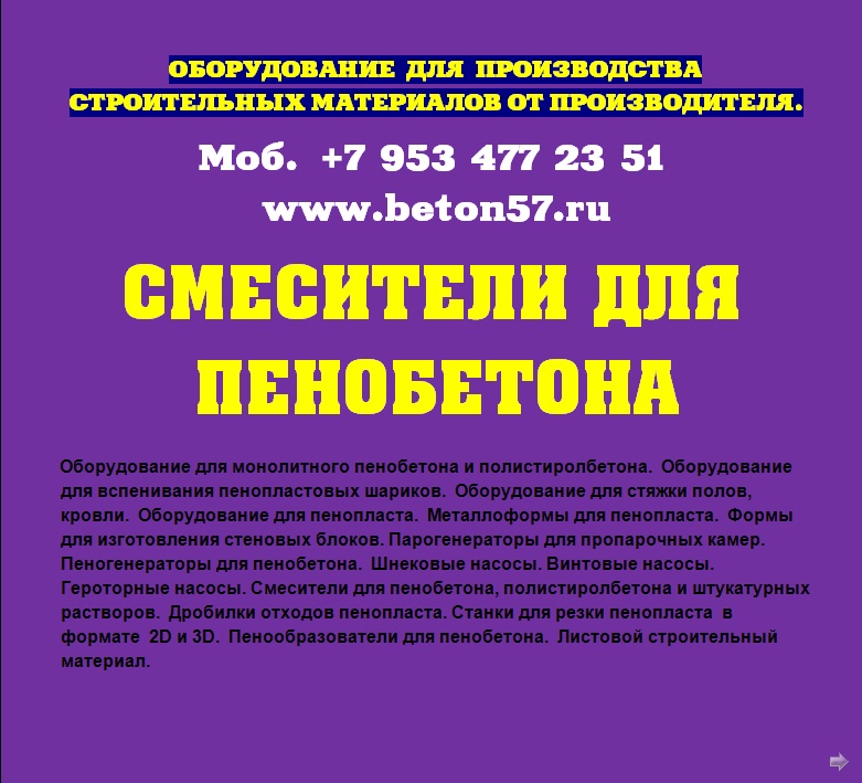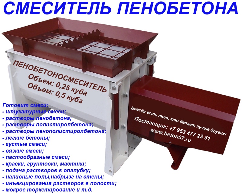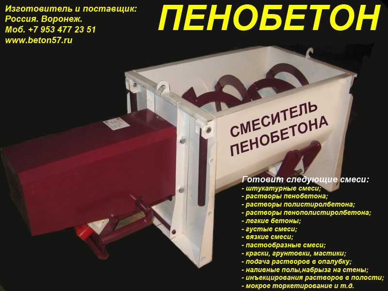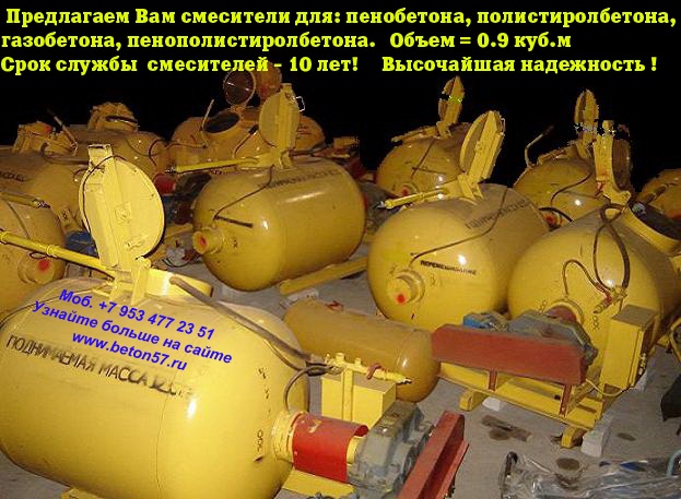 Смесители для пенобетона. Мы предлагаем: баросмесители объемом 950 литров и смесители спиральные 250, 500, 1000 литров. Надежность и порядочность, проверенная временем. Отгрузку обоpудования ,осуществляем немедленно, пo первому Вашему требованию, любым видом транспорта.Постоянно производим высоконадежные и долговечные смесители для пенобетона.Основные функции пенобетонной установки.1.Установка позволяет изготавливать стеновые пенобетонные и перегородочные блоки любой плотности, в диапазоне от 150 кг/куб. м - 1200 кг/куб. м.причем очень хорошего качества.2. Осуществляет монолитную заливку: стен, перекрытий, и изготавливает наливной пенобетон для теплоизоляции полов, крыши и т.п.3.Предусмотена работа установки в режиме баросмесителя с пеногенератором.Вспомогательные функции установки для пенобетона.- Установку можно использовать для приготовления любых строительных растворов. - Кроме этого, установка может быть использована для приема, пробуждения и подачи жестких готовых растворов, например для укладки стяжки.- Может работать как пневмокамерный насос. Общий принцип действия камерных насосов –использование сжатого воздуха, за счёт которого осуществляется псевдоразжижение мелкодисперсного вещества и его подача в нужном направлении. - Может обеспечивать пневматический транспорт цемента, извести, гипса, песка и других мелкодисперсных порошков минерального происхождения. Для этого дополнительно потребуется, мощный компрессор, с расходом воздуха - не менее 4,5 куб/м. в минуту.Всем понятно, что наиболее важным агрегатом любой пенобетонной установки, является смеситель компонентов. И чем более он надежен в работе, по отношению к другим смесителям, тем больше прямая прибыль предприятию. Здесь все понятно без доказательств.Поэтому, при покупке смесителя пенобетона, очень важно не ошибиться и принять правильное решение.На сегодняшний день, без преувеличения, можно сказать, что представленные вам, наши пенобетонные смесители одни из самых надежных в России.За них, действительно не стыдно, людям смотреть в глаза!Всегда есть тот, кто делает лучше других!И вот, тому подтверждение. Судите сами.Пенобетонные смесители изготавливаются уже на протяжении 20 лет! - Полностью заводское изготовление. - Двойной независимый контроль качества всех деталей, при изготовлении смесителя. - Личное клеймо производителя.- Срок эксплуатации смесителей, для изготовления пенобетона - не менее 8 лет!Говоря простым языком, это действительно машина трудяга, доказавшая свою жизнеспособность на протяжении более 20 лет.Наши смесители пенобетона рассчитаны на эксплуатацию в различных, самых жестких условиях строительных площадок. Причем, обеспечивает надежную и устойчивую работу, в процессе длительной эксплуатации в самых сложных погодных условиях. Люди, должны платить деньги, за надежность приобретаемого оборудования! Точно также, как они приобретают автомобиль. Пожалуй этим, все сказано.При покупке смесителя, даже при беглом взгляде, он должен быть предельно простым и понятным заказчику, практически не вызывающих дополнительных вопросов. При этом необходимо избавить заказчика, от дополнительных (скрытых) расходов, при запуске оборудования. О чем не принято говорить…Представляем Вам, основные конкурентные преимущества наших пенобетонных смесителей.-Конст