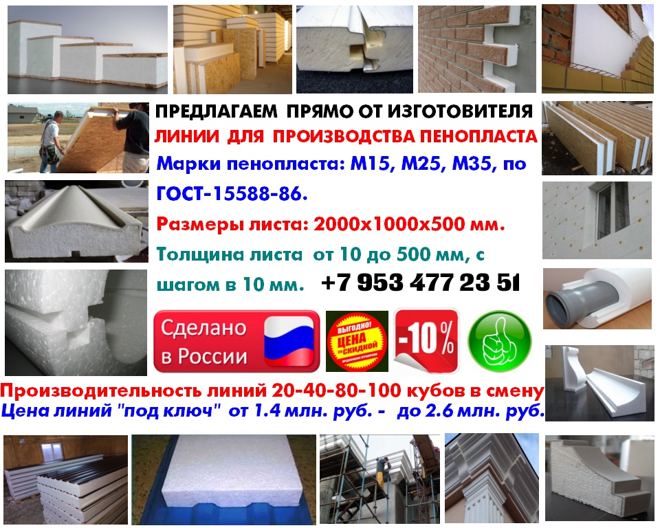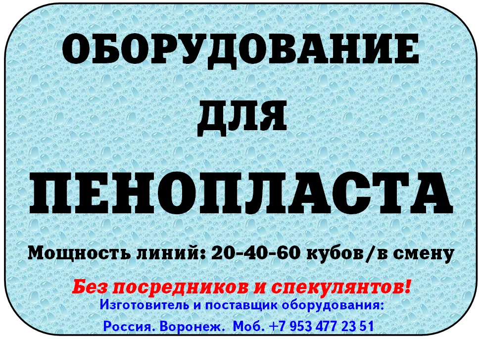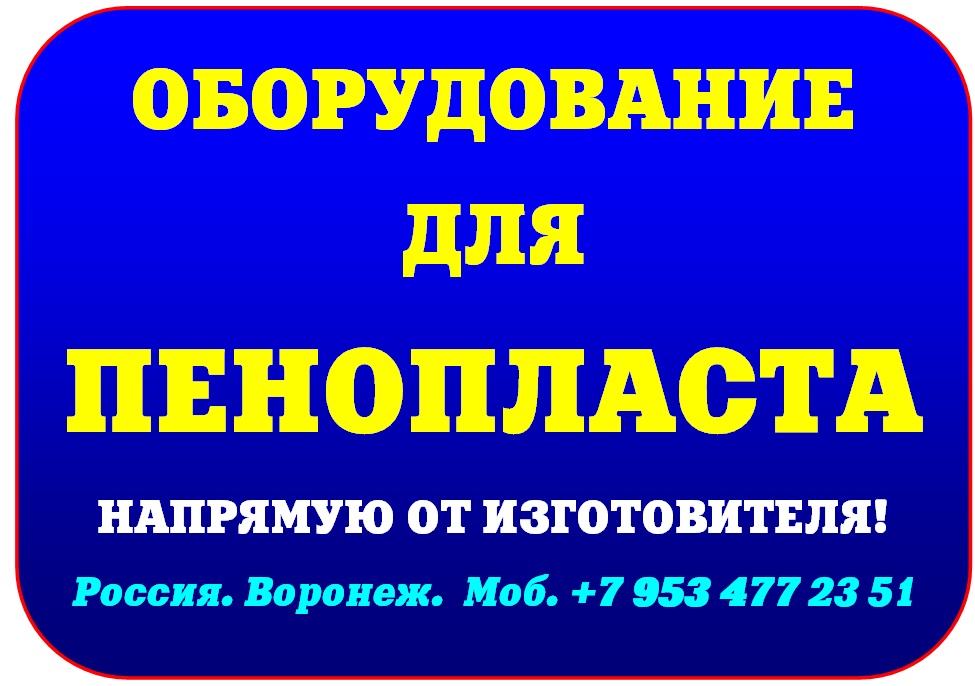 Завод для изготовления пенопласта, от производителя! Беден не тот, у кого нет денег, а тот, у кого нет мечты купить собственный "свечной мини-заводик"! Или маленький, пенопластовый заводик... Предлагаем индивидуальные условия оплаты заказа. Поставка от производителя – это выгодные цены и гарантия качества. Залог доверия к нам - профессиональное, своевременное и качественное исполнение заказов. Многолетний опыт изготовления оборудованиРекомендуем Вам наше оборудование, для изготовления пенопласта.Смотрите видео. https://www.youtube.com/watch?v=Wes_GdJSg48&t=3s Имеется оборудование, мощностью: 40, 60 и 80 кубов в смену.Для производства пенопласта необходимо следующие агрегаты :ПарогенераторПредвспенивательСушильная установкаБункер вылеживанияКомпрессорБлок формы для спеканияУстановка вакуумированияНакопитель вакуумаНакопитель сжатого воздухаСтанок горизонтальной резкиНаше оборудование для производства пенопласта, можно купить в составе одной технологической линии или прибрести каждый агрегат отдельно.Также потребуется:Помещение - 150 кв.мВысота потолков - 4,5 мСырье: полистирол вспенивающийся.Насыщенный пар, температурой 110-140 С (от парогенератора).Подключение к электрической сети: напряжение 380 В, мощность линии 90 -100 кВт.Холодная вода -с расходом 500 литров в смену.Производим поставку, шеф- монтаж, наладку оборудования для изготовления пенопласта!Видео работы оборудования по производству пенопласта https://www.youtube.com/watch?v=Wes_GdJSg48&t=3sЖдем Вас, в числе наших клиентов!Контактное лицо: Владимир Петрович.