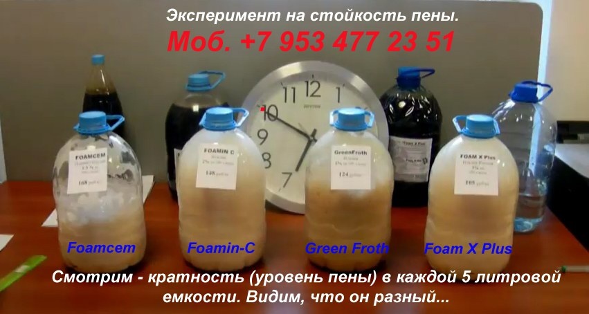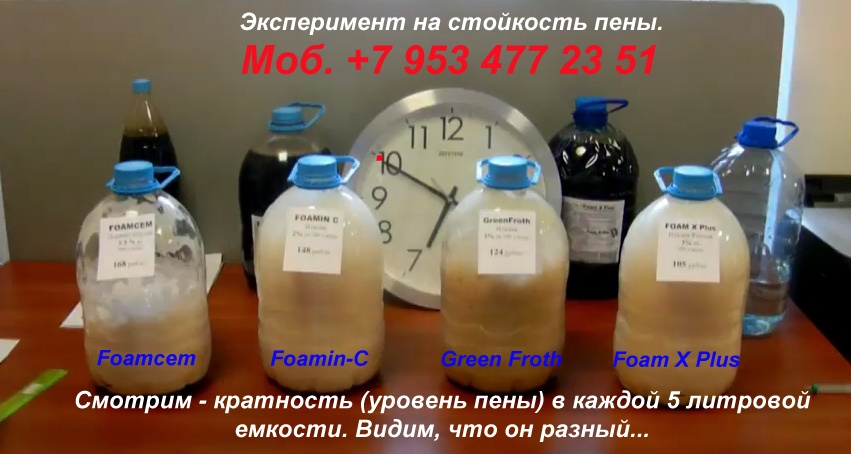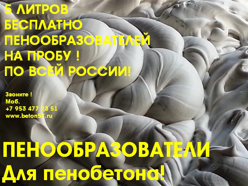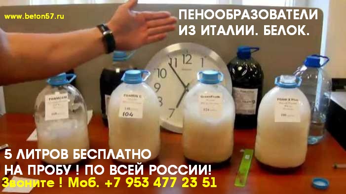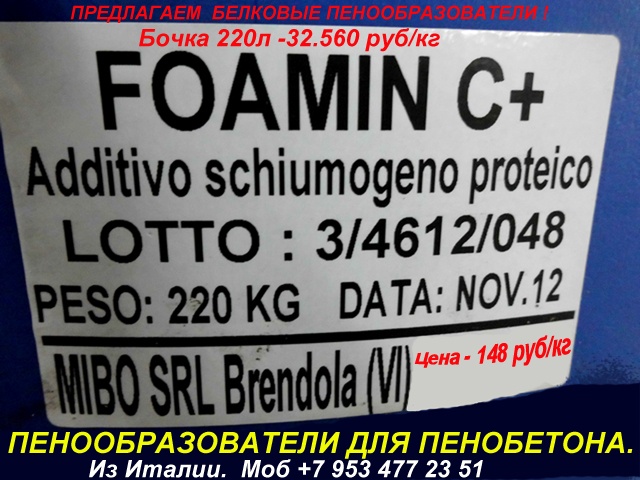 Предлагаем пенообразователь для пенобетона.Продажи пенообразователя только бочками по 200 литров!Предлагаем Вам - белковый пенообразователь Foamin C, пр-во Италия. Предлагаем Вам - белковый пенообразователь Foamcem, пр-во Италия. Предлагаем Вам - белковый пенообразователь Foam X Plus, совместное пр-во Италия-Россия. Пенообразователь. Постоянно продаем белковый пенообразователь FOAMIN C,на сегодняшний день - он лучший для пенобетонщиков! Цены на белковые пенообразователи от 97 до 149 руб за литр. Предлагаем Вам - белковый пенообразователь Foamin C, пр-во Италия.Предлагаем Вам - белковый пенообразователь Foamcem, пр-во Италия.Предлагаем Вам - белковый пенообразователь Foam X Plus, совместное пр-во Италия-Россия. С пенообразователем FOAMIN C Вы получаете: 1. Ускоренный набор прочности 2. Отсутствие проседания пенобетонной массы 3. Значительно уменьшает расход цемента 4. Соответствие продукции ГОСТу (высокая прочность, отсутствие сколов на блоке) 5. Уменьшает срок схватывания и твердения пенобетонной массы 6. Очень повышает стойкость пенобетонной массы (возможность транспортировки) 7. Вы можете получить пенобетон низкой плотности от 200 кг/м3 8. Не требует добавления ускорителей И как следствие всего этого, отсутствие брака готовой продукции. Разница с аналогами в цене многократно окупается! Технические данные протеинового пенообразователя для пенобетона FOAMIN С Состав: Белки 25%, минеральные соли 4%, Внешний вид: Темная жидкость, не ядовитая, не подвергающаяся ферментации.Плотность: 1,11 г/см3 Растворимость в воде 20'С: полнаяНесовместимость: масла, смазки, похожие по консистенции веществаХранение: в вентилируемом, прохладном месте, исключающем прямые солнечные лучи Срок годности: в оригинальной, запечатанной упаковке и способе хранения, около 3 лет. Соответствие экологическим нормам: 0,6 +/- 0,2 биоразложение в соответствии с нормами Рекомендуемый вес пены: 60 -70гр/л Стабильность 0,7-2,5 часа...Вы бедны и не можете открыть свое производство? Бедность - это удобно. Не надо шевелиться, не надо развиваться, не надо напрягаться. Проще сказать - я бедный, у меня никогда ничего не будет. Еще хуже - напрягаться годами за копейки, когда можно напрячься один раз, - взять кредит, купить оборудование, открыть свое дело и выскочить хотя бы в средний класс. Обдумайте это! Контактное лицо: Владимир Петрович.
