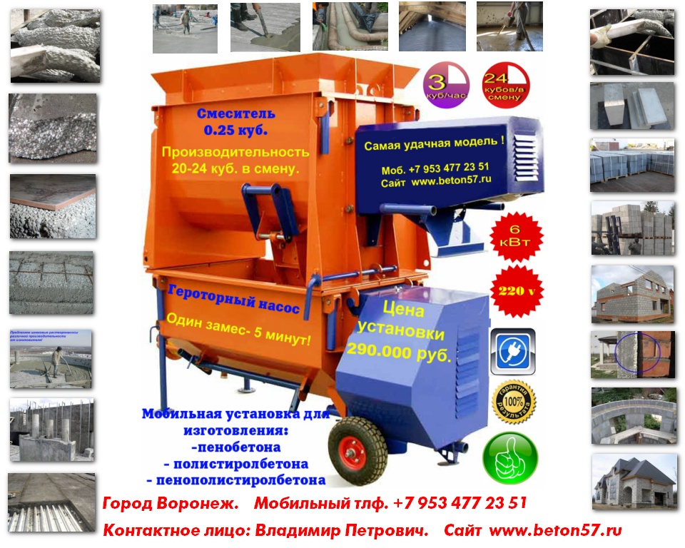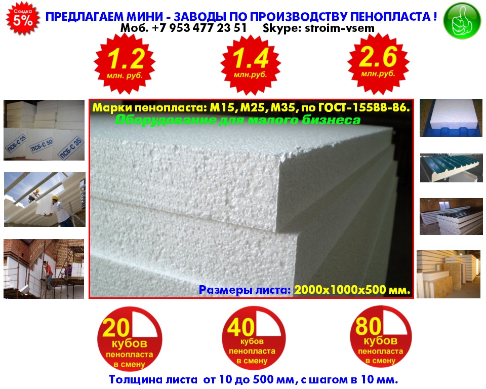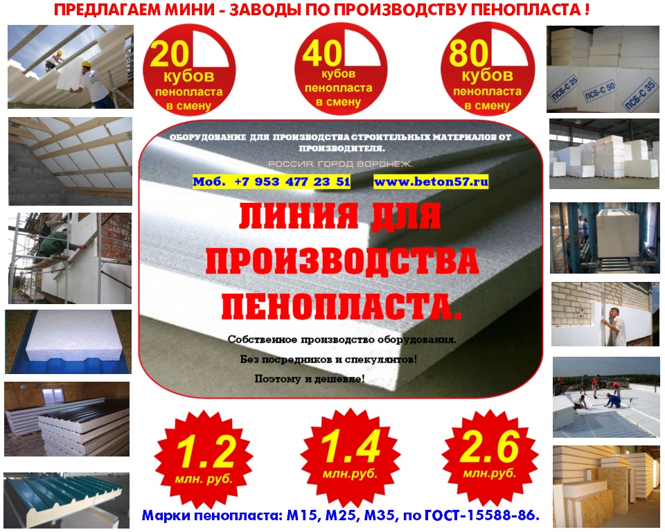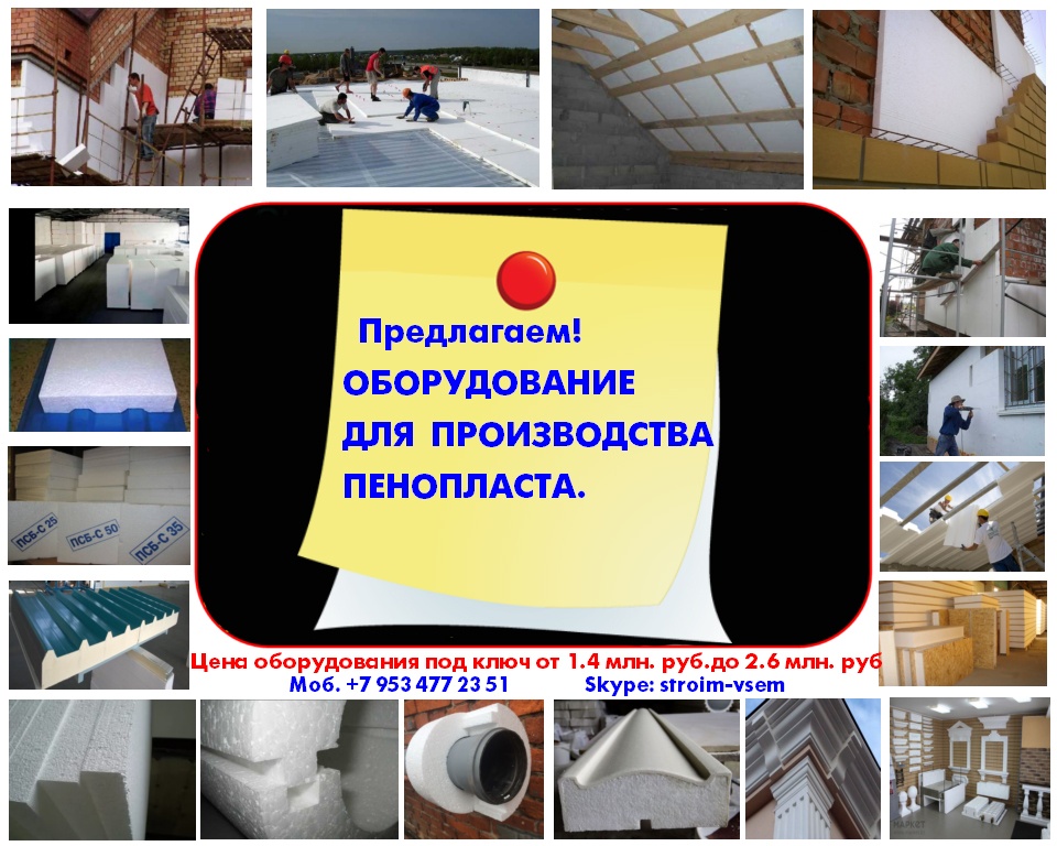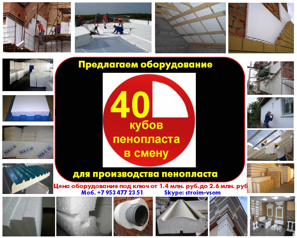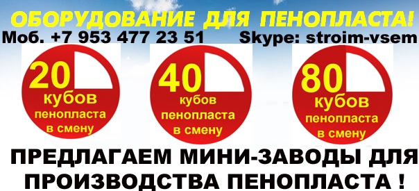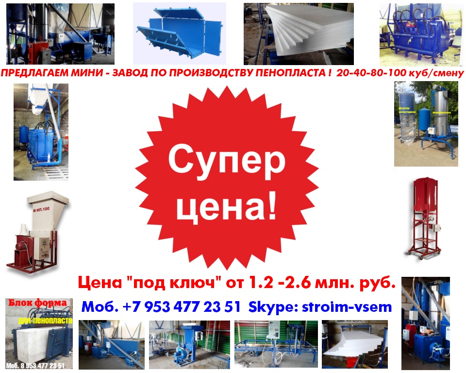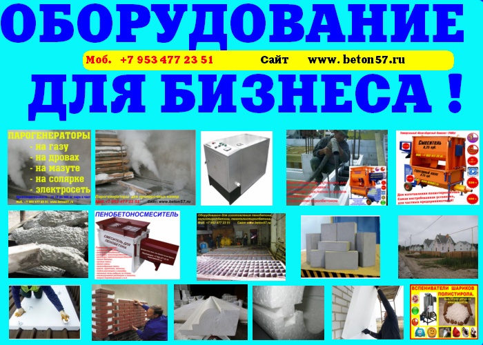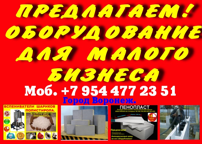Производим и предлагаем вам наше оборудование, для малого бизнеса!Мы сами производим все необходимое оборудование, мы не являемся посредниками, ничего не перепродаем. Поэтому, в нашем оборудовании сочетается высокое качество, при доступных ценах.Оборудование для пенопласта.Оборудование для пеноблоков.Оборудование для монолитного пенобетона.Оборудование для производства полистиролбетона.Оборудование для пенополистиролбетона.Смесители для пенобетона.Смеситель для полистиролбетона.Смеситель для пенополистиролбетона.Баросмесители для пенобетона.Баросмесители для полистиролбетона.Сушилки для песка.Шнековые насосы.Винтовые насосы.Героторные насосы.Насосы для вязких жидкостей.Насосы для пенобетона.Насосы для полистиролбетона.Производство полистиролбетона.Паровые котлы на всех видах топлива.Парогенераторы электрические.Парогенераторы для пропарочных камер.Паровые котлы.Блочно модульные котельные.Модульные котельные.Мобильные котельные.Парогенераторы для пропарочных камер и сушилок. Парогенератор для бетонных изделий.Парогенераторы промышленные.Парогенератор для сушильных камер.Парогенератор для пропарки бетона.Парогенераторы для сушки древесины.Парогенераторы для пропарки стеновых блоков.Парогенераторы для выращивания грибов.Парогенераторы для авто мойки автосервиса и сто.Оборудование для резки пенопласта. Станок чпу для резки пенопласта.Станок для фигурной резки пенопласта.Станок для резки пенопласта на листы.Дробилка для пенопласта.Измельчитель отходов пенопласта.Станок для резки пенопласта на листы. Вспениватели шариков полистирола Все наше оборудование, прошло проверку временем, в суровых условиях на строительных площадках России. Почему рентабельно покупать у нас? 1.Выгодные цены!2.Предлагаем продукцию только высокого качества3.Индивидуальный подход! 4.Опыт!5.Предлагаем Вам удобные условия доставки, в любой город России и СНГ. За более детальной информацией, а также данными о ценах на оборудование и на наши услуги, пожалуйста свяжитесь с нами, любым удобным для Вас способом.Предлагаем индивидуальные условия оплаты заказа. Поставка от производителя – это выгодные цены и гарантия качества. Залог доверия к нам - профессиональное, своевременное и качественное исполнение заказов. Многолетний опыт изготовления оборудования, высокое мастерство и компетентность.Если хотите узнать больше, напишите нам или позвоните – мы с удовольствием ответим на все вашиКонтактное лицо: Владимир Петрович. Город Воронеж.