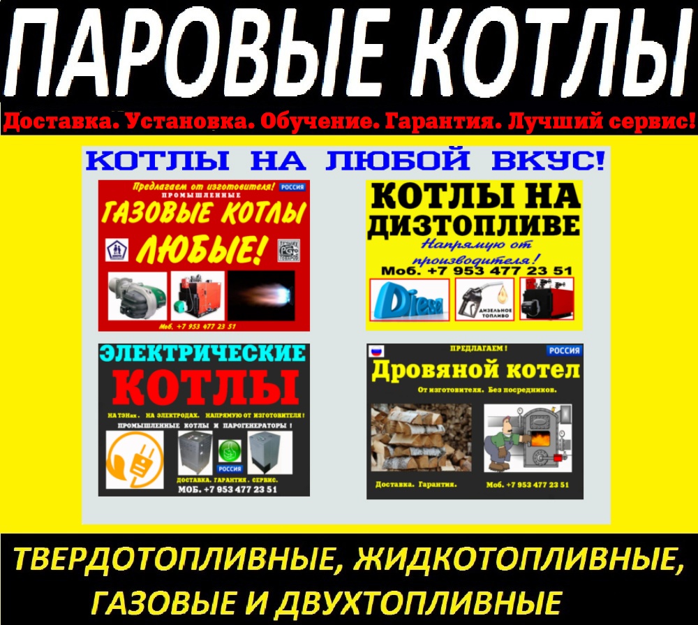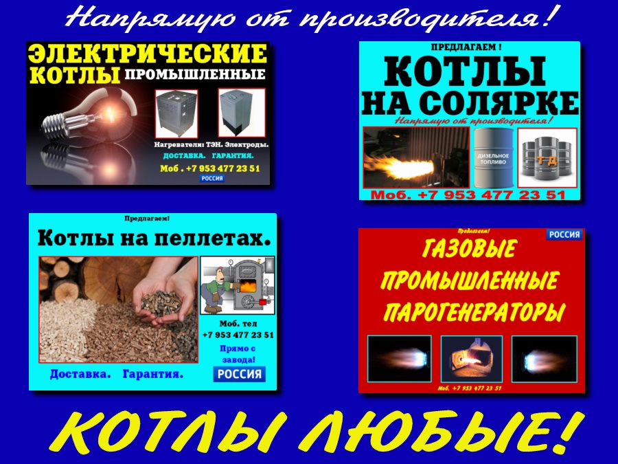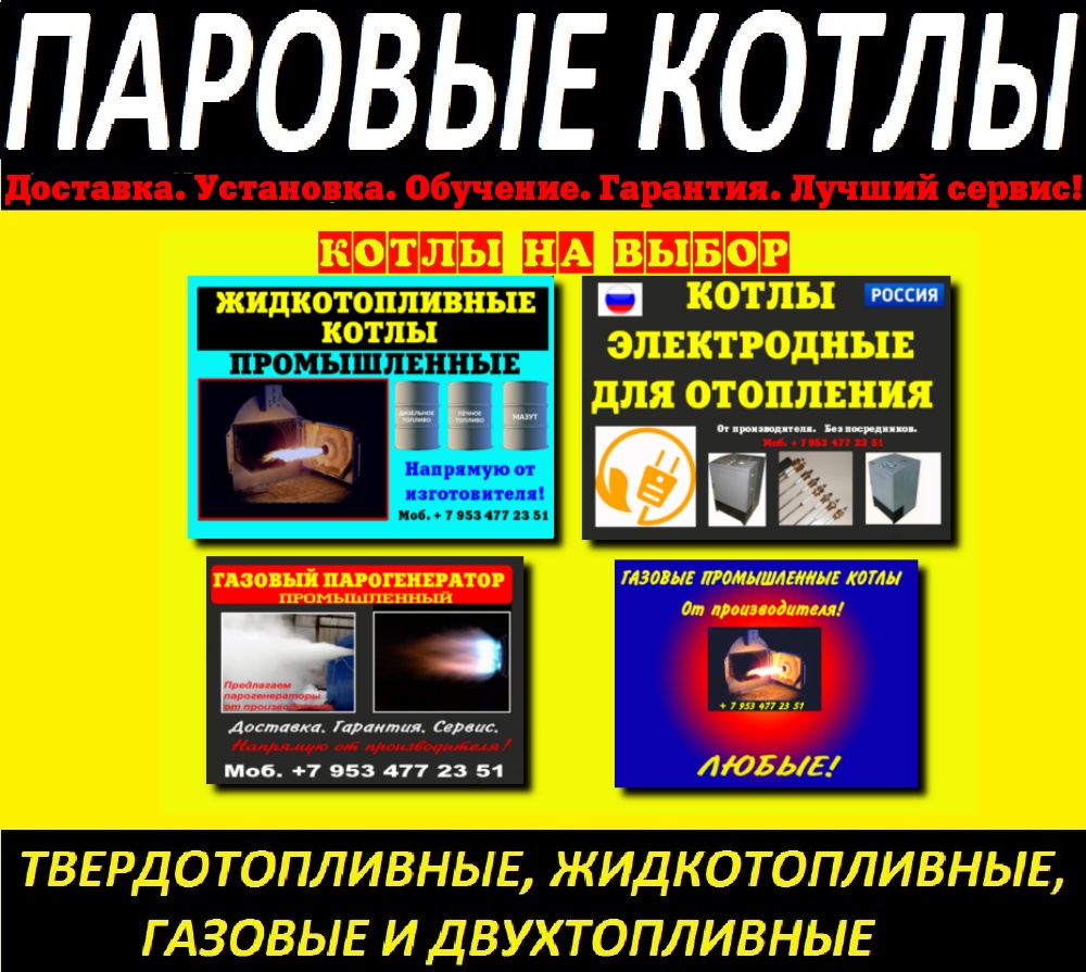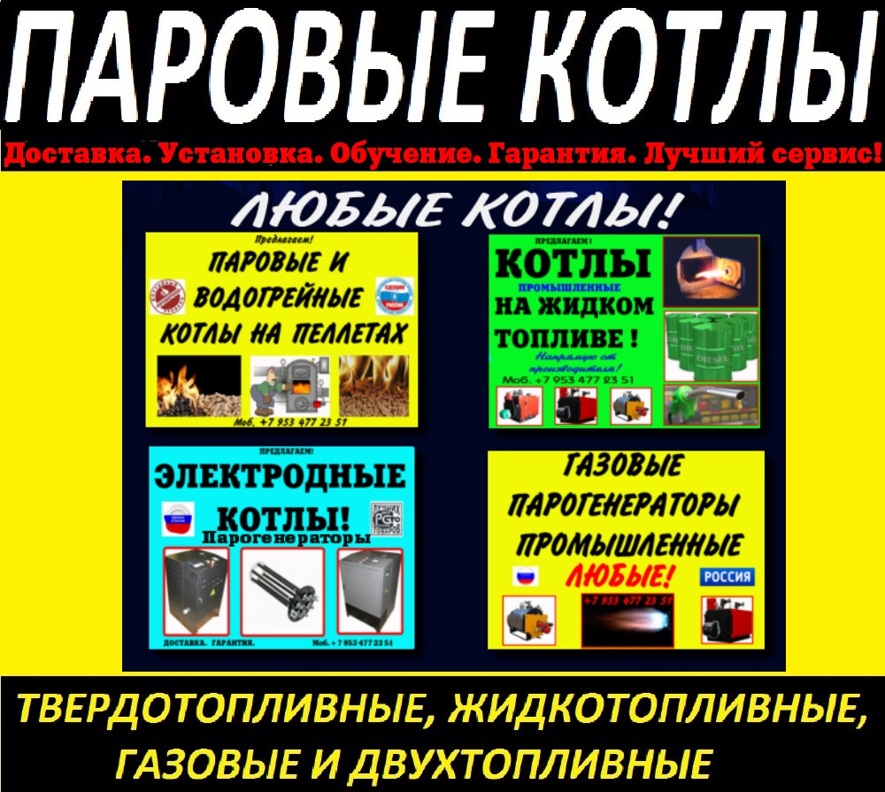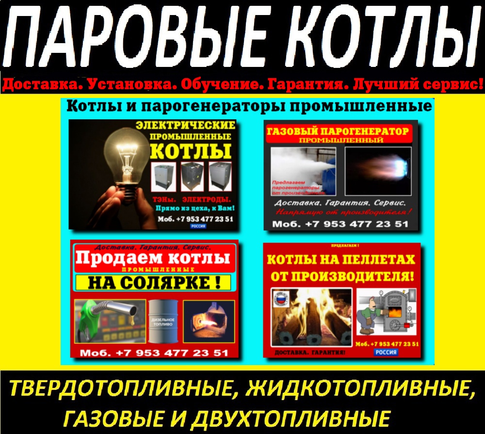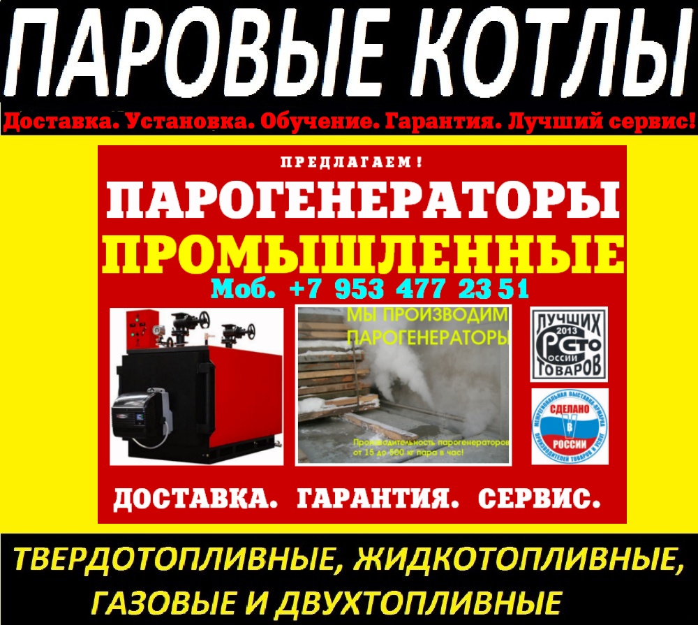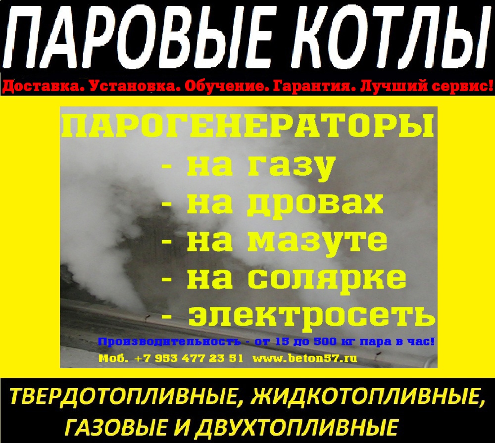 Предлагаем парогенераторы промышленные. Пароые котлы. На газу , на жидком топливе, на твердом топливе и электрические! Купить парогенератор промышленный можно у нас. Какой лучше купить парогенератор? У нас постоянно имеются парогенераторы для ваших пропарочных камер. Производительность по пару: от 15 до 500 кг/час.Электрическая мощность парогенераторов : от 15 кВт до 160 кВт.Парогенераторы с рабочим давлением до 0.5 аТмПарогенераторы с рабочим давлением до 6 аТм. Имеются парогенераторы: на газу , на жидком топливе, на твердом топливе и электрические! Мы 15 лет, изготавливаем промышленные парогенераторы различной производительности для различных сфер применения. Наиболее востребованы наши парогенераторы, для комплектации пропарочных и сушильных камер. В связи с чем, напоминаем, расход пара при формовании и тепловлажностной обработке железобетонных изделий. Расход пара на полигонах, при пропаривании бетона в летних условиях на стенде и в напольных камерах 400—500 кг на 1 куб. м и в ямных камерах 300—400 кг на 1 куб. м .А в зимних условиях, соответственно 700—800 и 500—600 кг на 1 куб. м изделия. Для уменьшения расхода пара и обеспечения заданного режима прогрева, применяют пропарочные полуавтоматические камеры ямного типа, с повышенной герметичностью. В этой камере бетон пропаривают при температуре 100°С и 100%-ной относительной влажности. Благодаря равномерной и высокой температуре выдерживания срок пропаривания сокращается до 6—8 ч при расходе пара на 1 куб.м изделий не более 150—250 кг. После тепловлажностной обработки изделия производят распалубку. Главное достоинство - наши парогенераторы на зависят от жесткости воды! Мы выпускаем следующие генераторы пара. Парогенератор для пропарочных камер.Парогенератор для сушильных камер.Парогенераторы для пропарки бетона и ЖБИ.Парогенераторы для пропарки тротуарной плиткиПарогенераторы для пропарки бордюрного камня.Парогенераторы для пропарки перемычек, колец, заборов.Парогенераторы для пропарки искусственноо декоративного камня.Парогенератор для элементов малой садовой архитектуры.Парогенератор для изделий из пенобетона.Парогенератор для полистиролбетона,пенополистиролбетона.Парогенератор для изделий из газобетона.Парогенератор для газосиликата,пеносиликата.Парогенератор для пропарки керамзитобетонных блоков.Парогенератор для пропарки колец жби,крышек люков и лотков жби.Парогенератор для оборудования сушильных и пропарочных камер разного назначения.Парогенератор для систем отопления и горячего водоснабжения в жилых и промышленных зданиях.Парогенератор для производства насыщенного технологического пара в пищевой промышленности.Парогенератор для обработки молочной продукции.Парогенератор для мясной и рыбной продукции.Парогенератор для стерилизации тары в пищевой промышленности.Парогенератор для приготовления комбикормов в животноводстве.Парогенератор для пивоварения.Парогенератор для производстве фанеры.Парогенератор для горнодобывающей промышленности.Парогенератор для для строительства.Парогенератор для для муниципального хозяйства.Парогенератор для для сельского хозяйства.Парогенератор для отпаривания, в том числе и химчисток.Парогенератор для глажки.Парогенератор для дезинфекции.Парогенератор для СТО.Парогенератор для отпаривания одежды.Парогенератор