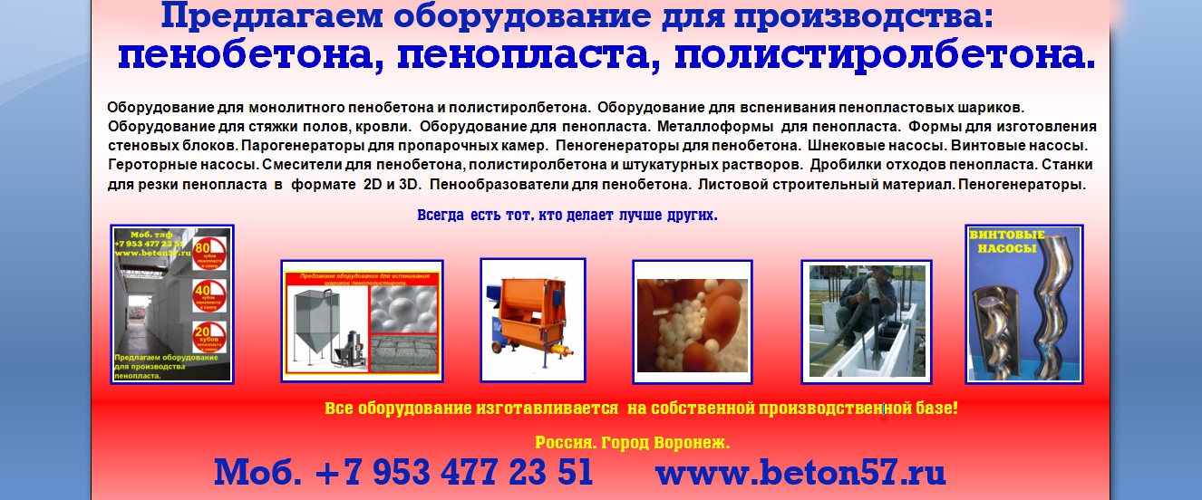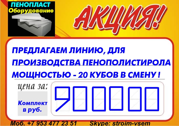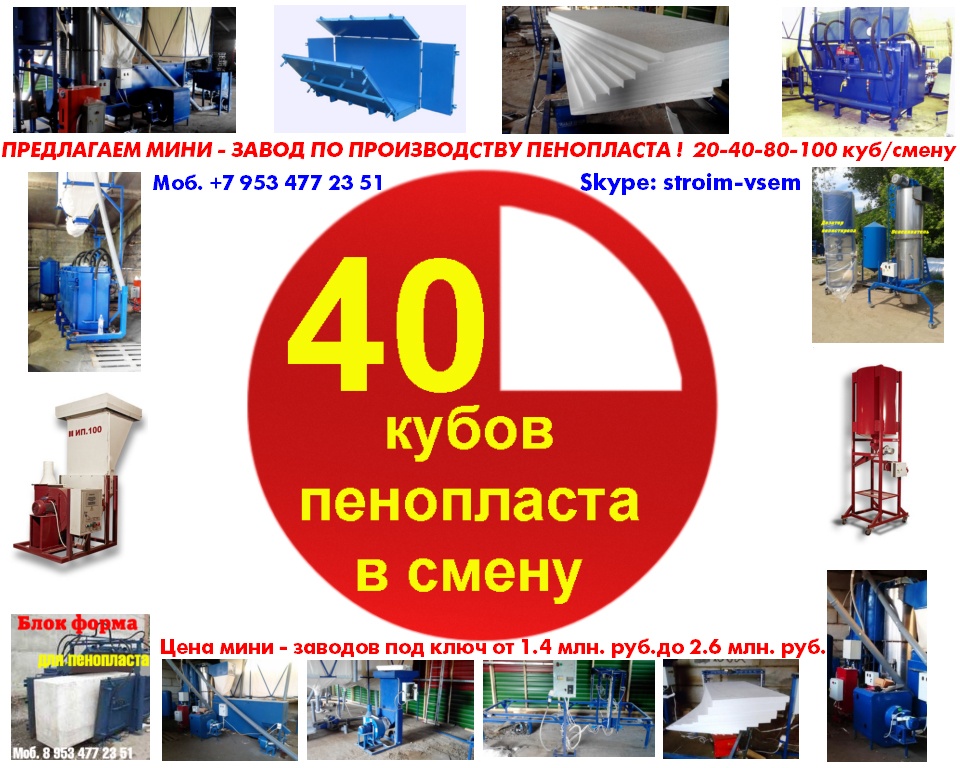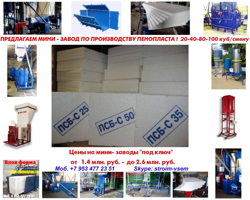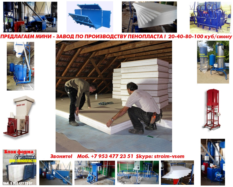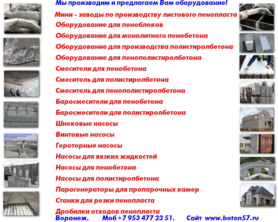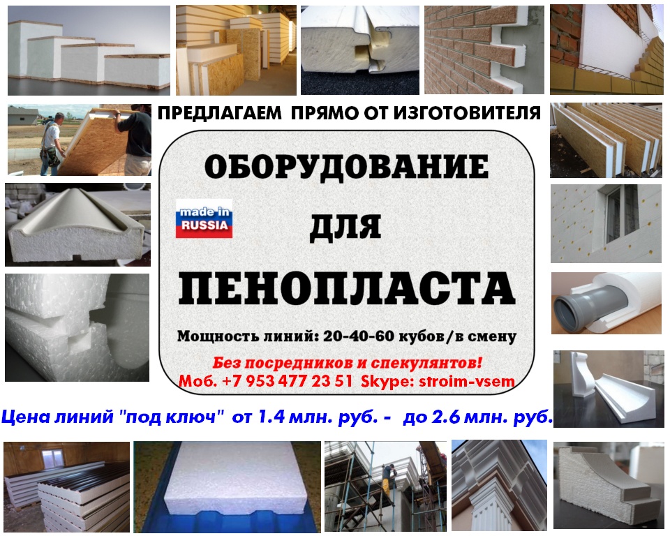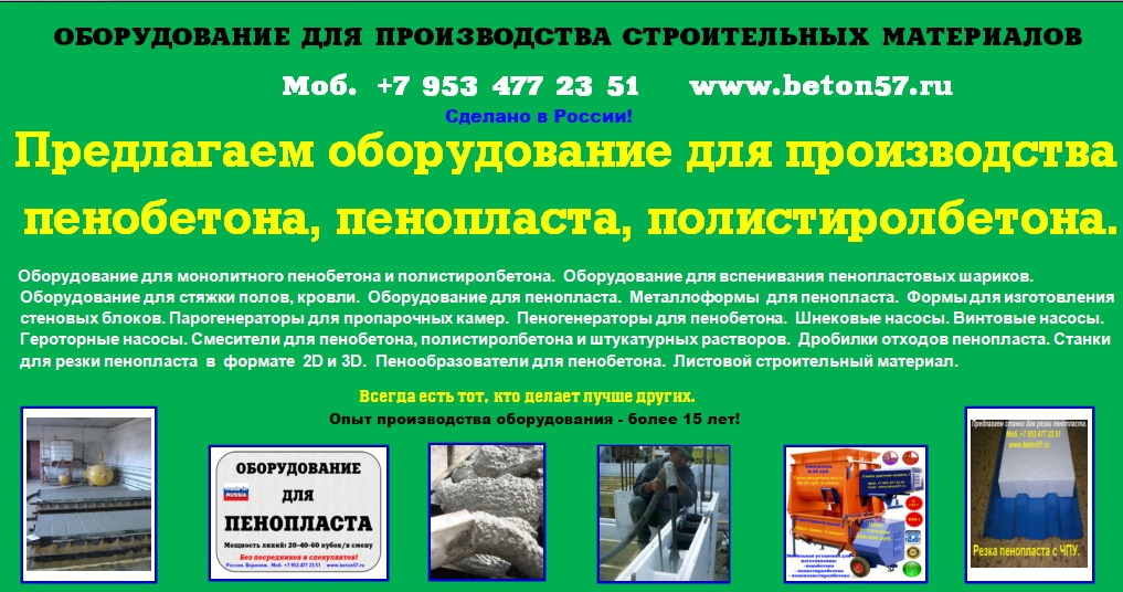 Оборудование для пенопласта пенобетона полистиролбетона. Все оборудование поставляется напрямую, исключительно от производителя.Видео здесь: https://www.youtube.com/watch?v=hVPawEHdA_E&feature=youtu.beПроизводим и предлагаем вам!Линии по производству листового пенопластаОборудование для производства полистиролбетонаОборудование для пенополистиролбетонаСмесители для пенобетонаСмеситель для полистиролбетонаСмеситель для пенополистиролбетонаБаросмесители для пенобетонаБаросмесители для полистиролбетонаШнековые насосыВинтовые насосыГероторные насосыНасосы для вязких жидкостейНасосы для пенобетонаНасосы для полистиролбетонаПроизводство полистиролбетонаПарогенераторы электрическиеПарогенераторы для пропарочных камерПарогенераторы для пропарочных камер и сушилок Парогенератор для бетонных изделийПарогенераторы промышленныеПарогенератор для сушильных камерПарогенератор для пропарки бетонаПарогенераторы для сушки древесиныПарогенераторы для пропарки стеновых блоковПарогенераторы для выращивания грибовПарогенераторы для авто мойки автосервиса и стоОборудование для резки пенопласта Станок чпу для резки пенопластаСтанок для фигурной резки пенопластаСтанок для резки пенопласта на листыФигурная резка пенопластаДробилка для пенопластаИзмельчитель отходов пенопластаРезка пенопласта Как сделать шарик из пенопласта. Книга.Фигурная резка пенопластаВспениватели шариков полистирола для пуфиков и псб У нас выгодно покупать выгодно покупать, потому что нет проблем с запчастями!Оборудование всегда в наличии. Любая форма оплатыРазумные цены. Надежность, проверенная временем.Да, вы самостоятельны и сами все прекрасно знаете... Да, вы умеете читать и пользоваться поиском... Да, вы не любите, когда вас отвлекают... Но все-таки… Если будут какие вопросы, не стесняйтесь, задавайте!Контактное лицо: Владимир Петрович.