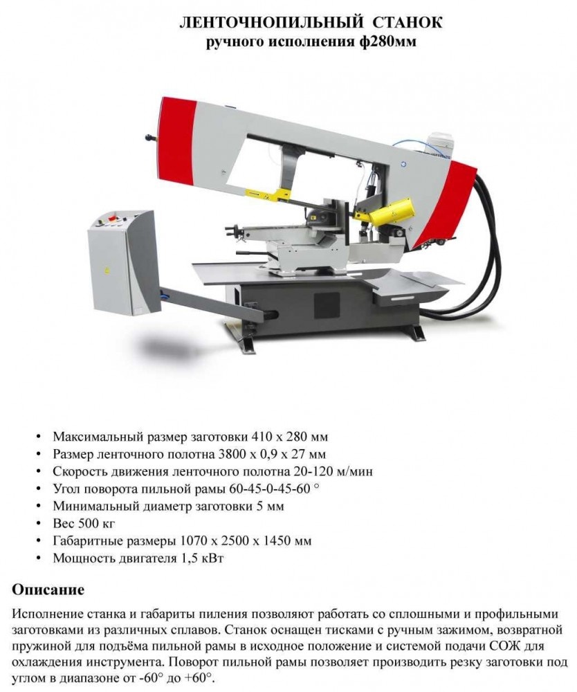 Исполнение станка и габариты пиления позволяют работать со сплошными и профильными заготовками из различных сплавов. Поворот пильной рамы позволяет производить резку заготовки под углом в диапазоне от минус 60 до плюс 60 градусов.