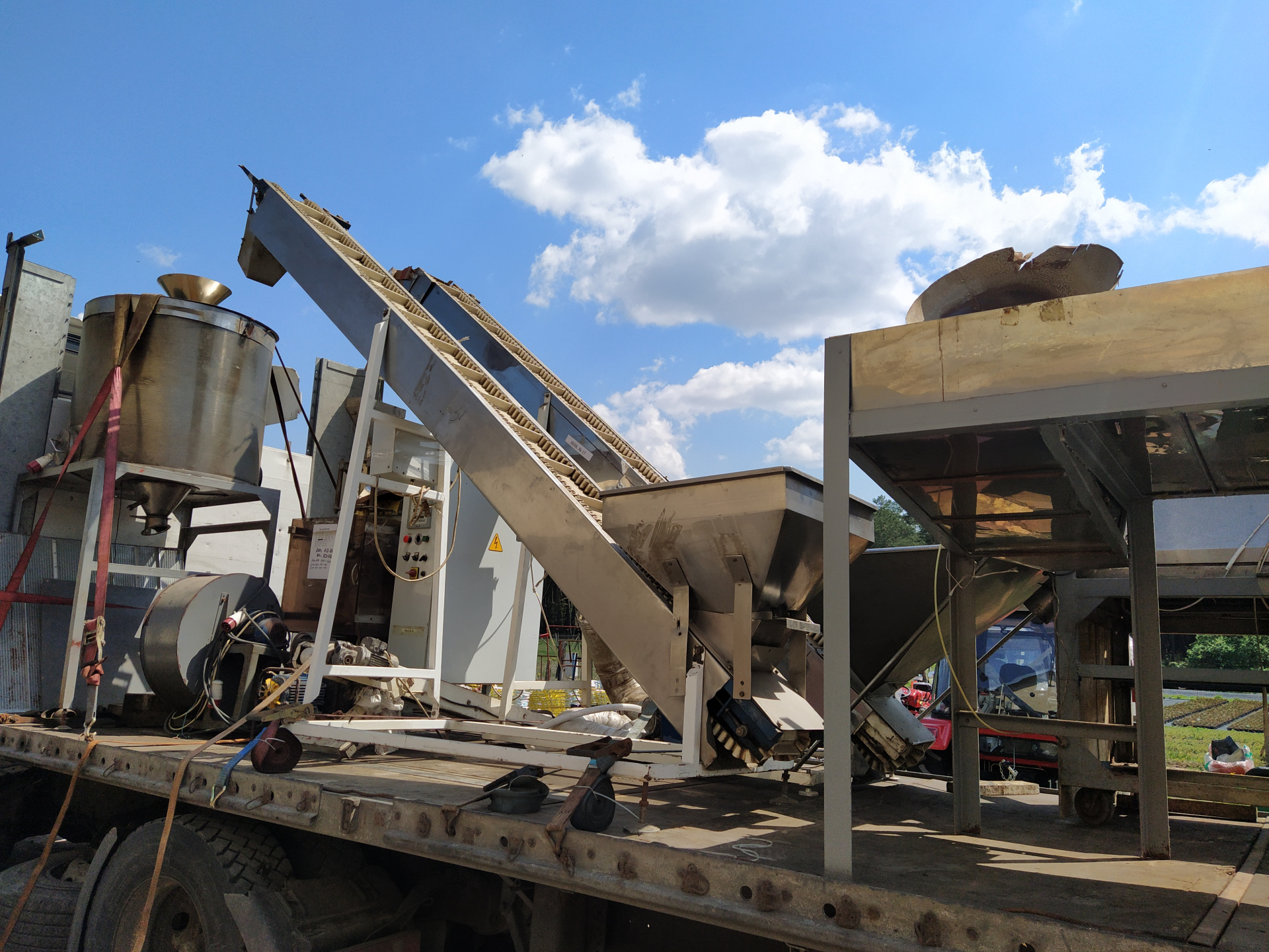 Скребковые транспортеры для пищевого производства из нержавеющей стали. Высота загрузки 800 мм, высота выгрузки 2200 мм. Ширина ленты 250 мм. Размеры бункера: