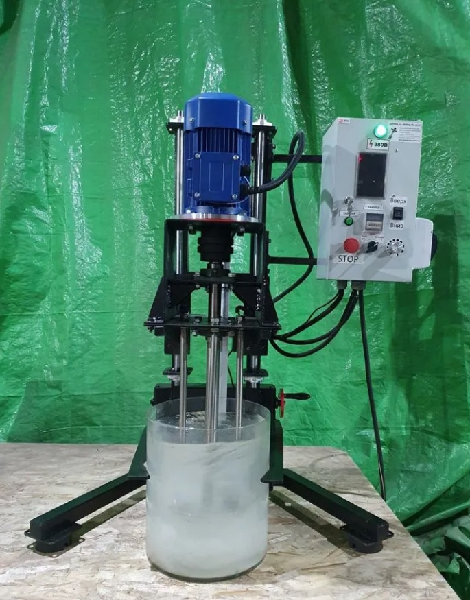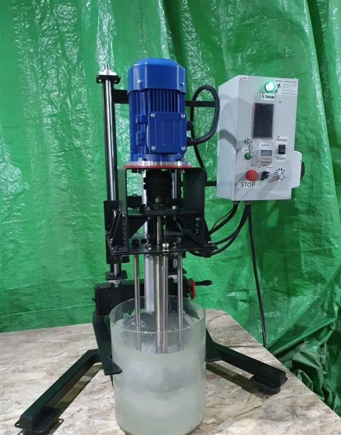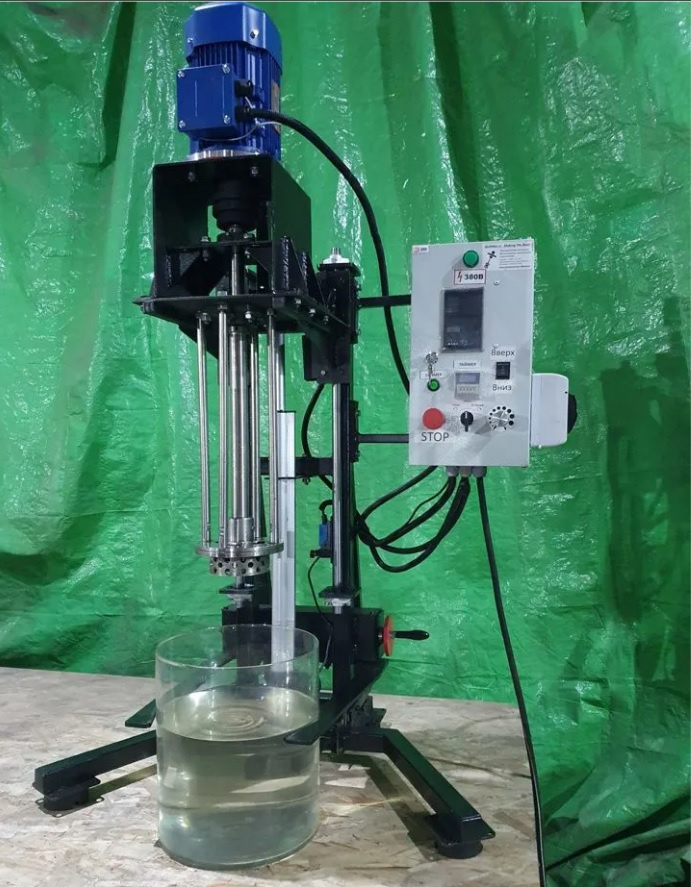 Гомогенизатор лабораторный, 2,2 кВт. Оснащён подъёмным электрическим механизмом. Изготовлен производственной компанией @QuickMix.