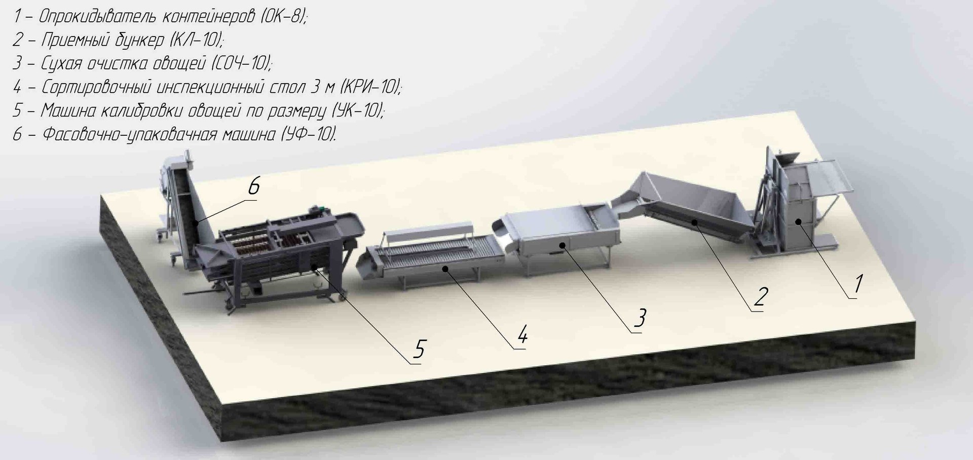 Оборудование для приема, переработки и (или) предпродажной подготовки овощей (картофель, морковь, лук, свекла) это процесс подготовки овощей (картофель, морковь, лук, свекла) к предпродажному виду , в который входит прием продукта ( овощей - картофель, морковь, лук, свекла), мойка продукта( овощей - картофель, морковь, лук, свекла), полировка продукта ( овощей - картофель, морковь, лук, свекла), сушка продукта( овощей - картофель, морковь, лук, свекла), сухая очистка продукта ( овощей - картофель, морковь, лук, свекла), сортировка и переборка продукта ( контроль качества и удаление брака ) , калибровка и сортировка продукта ( овощей - картофель, морковь, лук, свекла) по размеру, автоматическая либо полуавтоматическая фасовка и упаковка продукта ( овощей - картофель, морковь, лук, свекла) в сетку (опт, розница).
