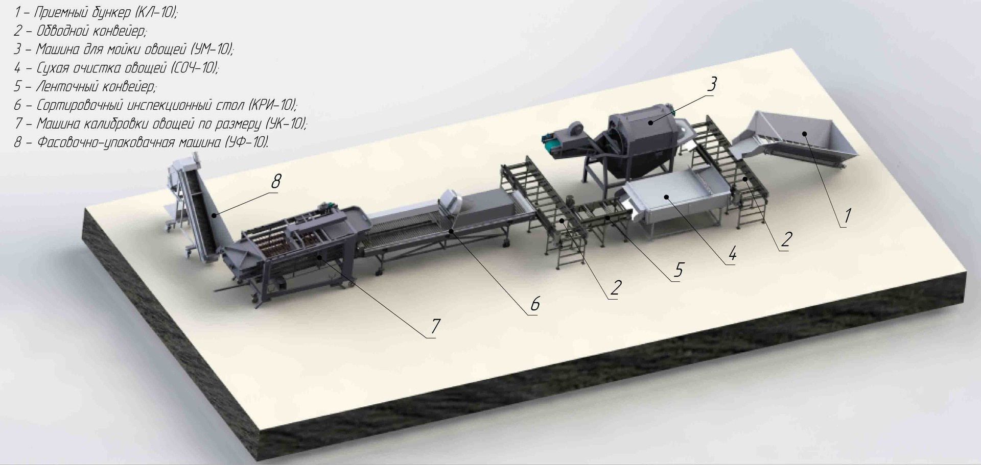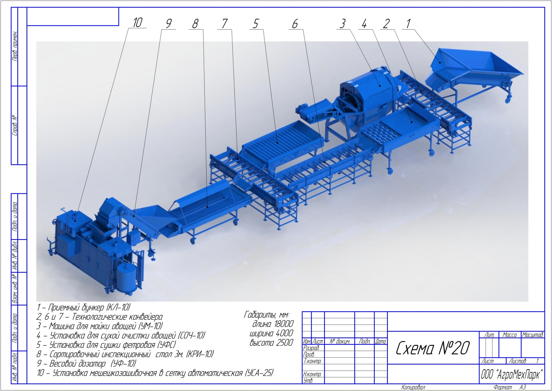 Завод изготовитель «АгроМехПарк» Республика Беларусь г.Минск занимается серийным производством сельскохозяйственного оборудования (технологические линии, мини-заводы) для приема, переработки и (или) предпродажной подготовки овощей (картофель, морковь, лук, свекла). Технологические линии выполняют следующие функции: прием овощей (картофеля), мойка, полировка, сушка, сухая очистка, сортировка и переборка, калибровка по размеру, автоматическая либо полуавтоматическая фасовка и упаковка в сетку (опт, розница). В нашем ассортименте есть опрокидыватели контейнеров, приемные бункера (к опрокидывателю контейнеров либо ручная загрузка), установки для отбивки от земли, машины для мойки и полировки картофеля и овощей, установки для сушки овощей после мойки, сортировочные столы, инспекционные столы, машины для калибровки овощей по размеру, фасовочное и упаковочное оборудование, подающие и загрузочные транспортеры, различные модификации конвейеров. Линия фасовки калибровки мойки чистки картофеля и овощей