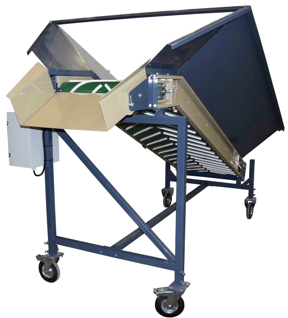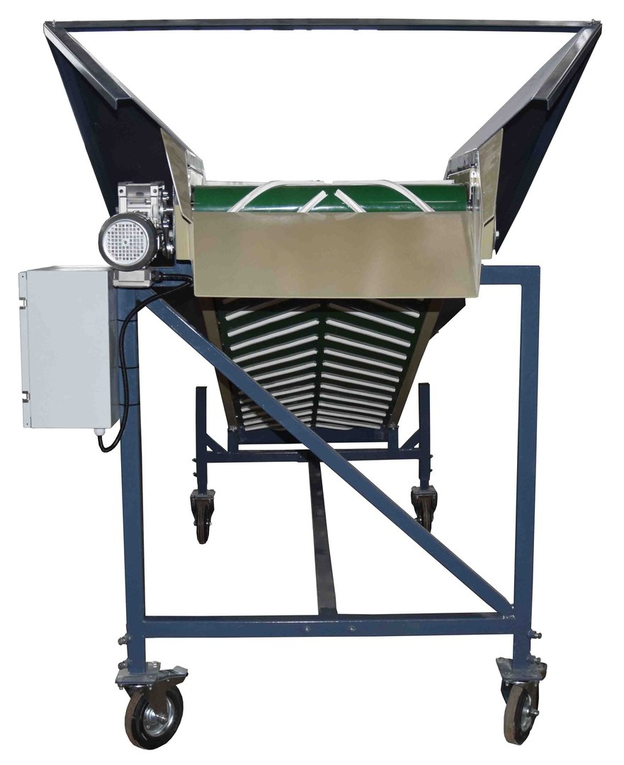 Приёмно-загрузочный бункер (конвейер приемный ленточный) – предназначен для приёма овощей (картофель, морковь, лук, свекла и др.) и равномерного и непрерывного перемещения их далее по технологической линии (прием, загрузка, выгрузка). Высота от пола до загрузочной емкости может регулироваться ступенчато, как в сторону уменьшения, так и в сторону увеличения. По отдельному заказу высота загрузки может быть изменена. Высота выгрузки бункера также регулируется выгрузным лотком. Имеется возможность заказать различные параметры высоты выгрузки корнеплодов. Главной опорной частью данного вида оборудования является бесконечная эластичная лента. Скорость движения полотна данного конвейера регулируется при помощи частотного преобразователя. По желанию заказчика может быть выставлена одна скорость без возможности регулировки с удешевлением конвейера (приемно-загрузочный бункер). Приемный бункер устанавливается перед машиной для мойки овощей, машиной сухой очистки, сортировочным инспекционный столом, машиной калибровочной и т.д. На приемный бункер дополнительно может устанавливаться установка для отбивки земли с отводящим транспортером для мусора. Приемный бункер может использоваться к опрокидывателю контейнеров, под ручную загрузку с сеток. Приемный бункер для картофеля овощей УПП - 1.07 АгроМехПарк
