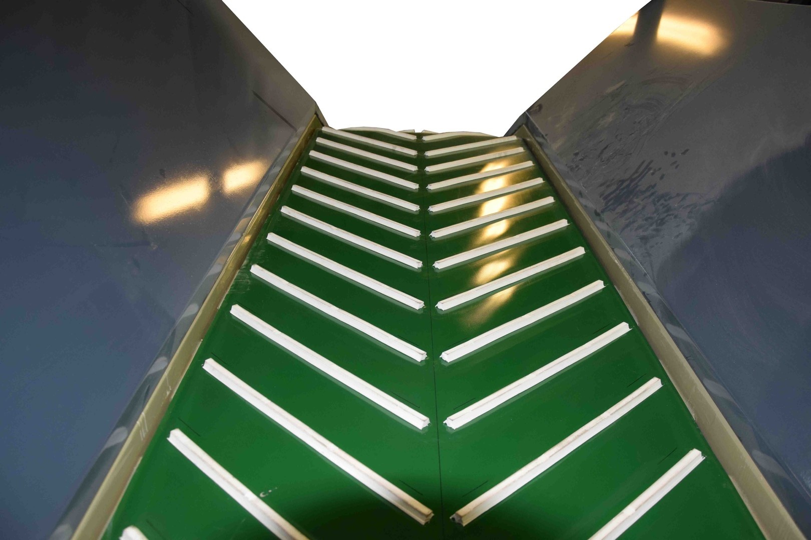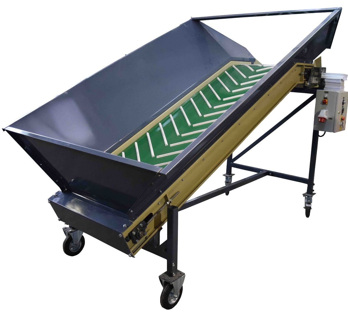 Приёмно-загрузочный бункер (конвейер приемный ленточный) – предназначен для приёма овощей (картофель, морковь, лук, свекла и др.) и равномерного и непрерывного перемещения их далее по технологической линии (прием, загрузка, выгрузка). Высота от пола до загрузочной емкости может регулироваться ступенчато, как в сторону уменьшения, так и в сторону увеличения. По отдельному заказу высота загрузки может быть изменена. Высота выгрузки бункера также регулируется выгрузным лотком. Имеется возможность заказать различные параметры высоты выгрузки корнеплодов. Главной опорной частью данного вида оборудования является бесконечная эластичная лента. Скорость движения полотна данного конвейера регулируется при помощи частотного преобразователя. По желанию заказчика может быть выставлена одна скорость без возможности регулировки с удешевлением конвейера (приемно-загрузочный бункер). Приемный бункер устанавливается перед машиной для мойки овощей, машиной сухой очистки, сортировочным инспекционный столом, машиной калибровочной и т.д. На приемный бункер дополнительно может устанавливаться установка для отбивки земли с отводящим транспортером для мусора. Приемный бункер может использоваться к опрокидывателю контейнеров, под ручную загрузку с сеток.