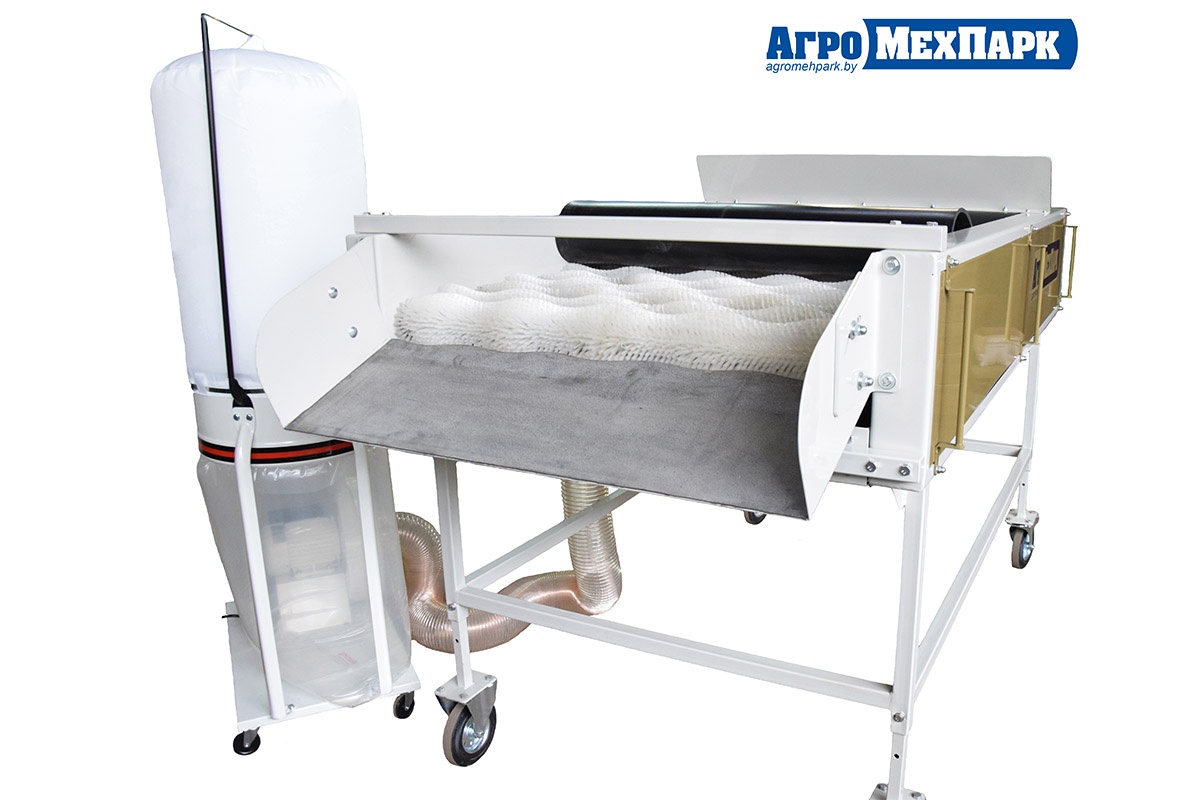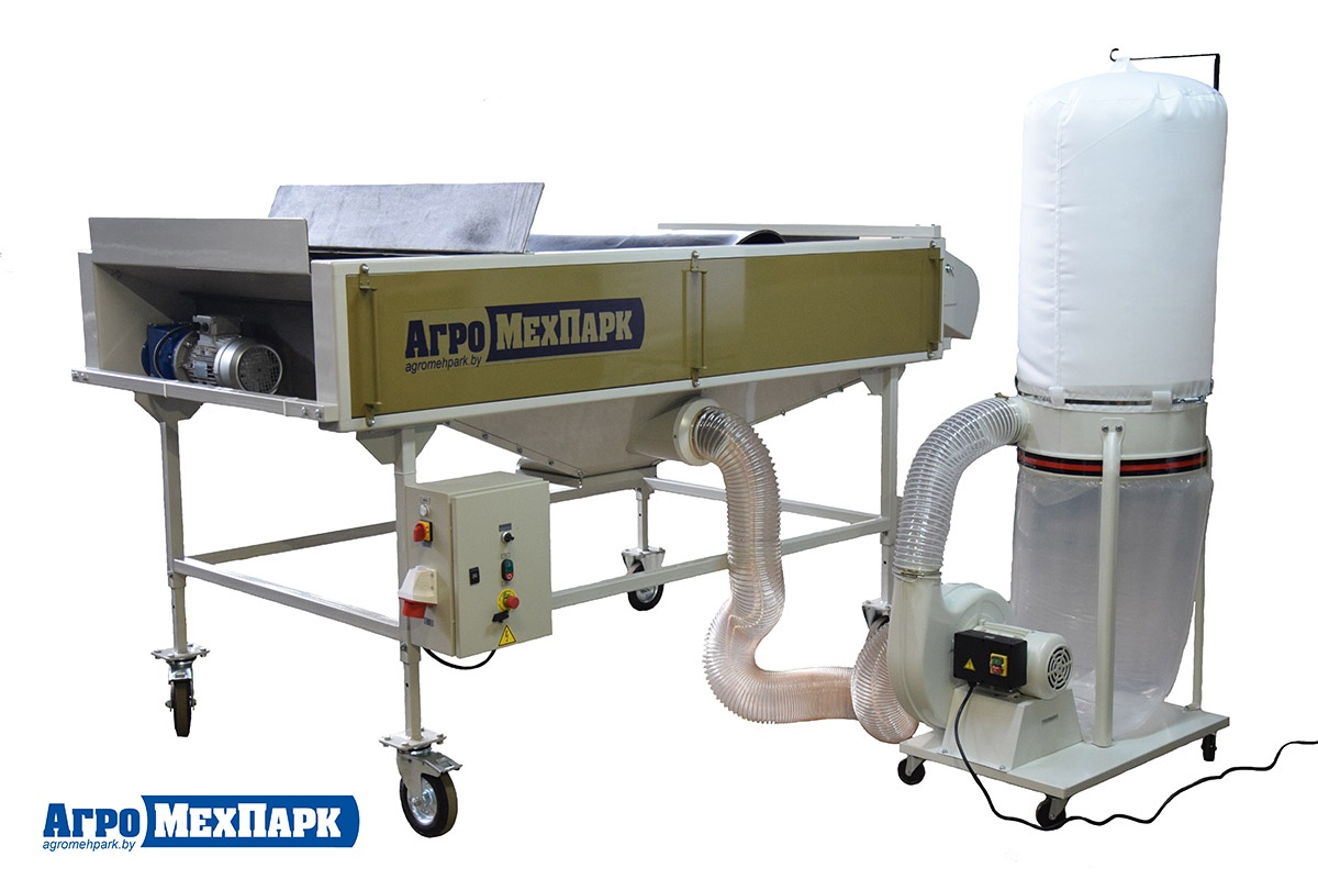 Установка устройство оборудование машина для сухой чистки картофеля овощей УСО- 1.16 АгроМехПарк предназначена для очистки от земли, чернозема, грязи, песка. Установка для сухой очистки картофеля и овощей придает товарный вид продуктам: картофель, морковь, свекла. Овощи вручную или с помощью приемного бункера подаются на вращающиеся круглые капроновые щётки, где очищаются и поступают в упаковочную тару (мешки, ящики) или на переборочный (сортировочный, инспекционный) стол. Резиновый кожух, закрепленный сверху над щетками улучшает эффект очистки и ограничивает запыленность воздуха. Скорость движения щеток регулируется частотным преобразователем. Очистка овощей предохраняет их от гниения при длительном хранении и придаёт им товарный вид перед реализацией. Установка для сухой очистки картофеля и овощей изготавливается с сетка-держателями на 4 сетки ( мешка, пакета) или с выгрузным лотком (под контейнер, ящик).