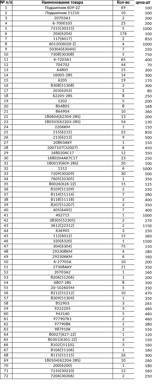 | 1 | Подшипник 609-2Z | 69 | 100 |