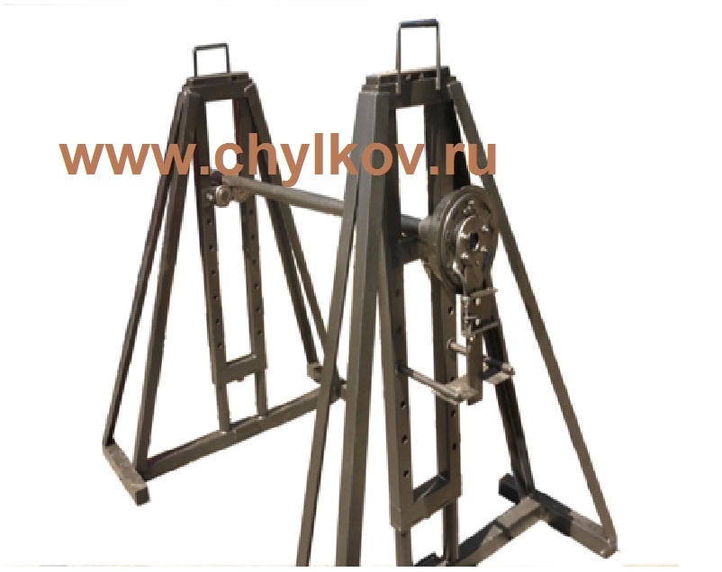 Комплект состоит из двух стоек с домкратами и оси диаметром 48 м с поджимными башмаками и тормозной системой, для останова вращения барабана при размотке.