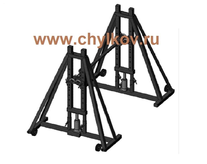 Комплект состоит из двух стоек с домкратами и осей диаметром 48 мм и 108мм.