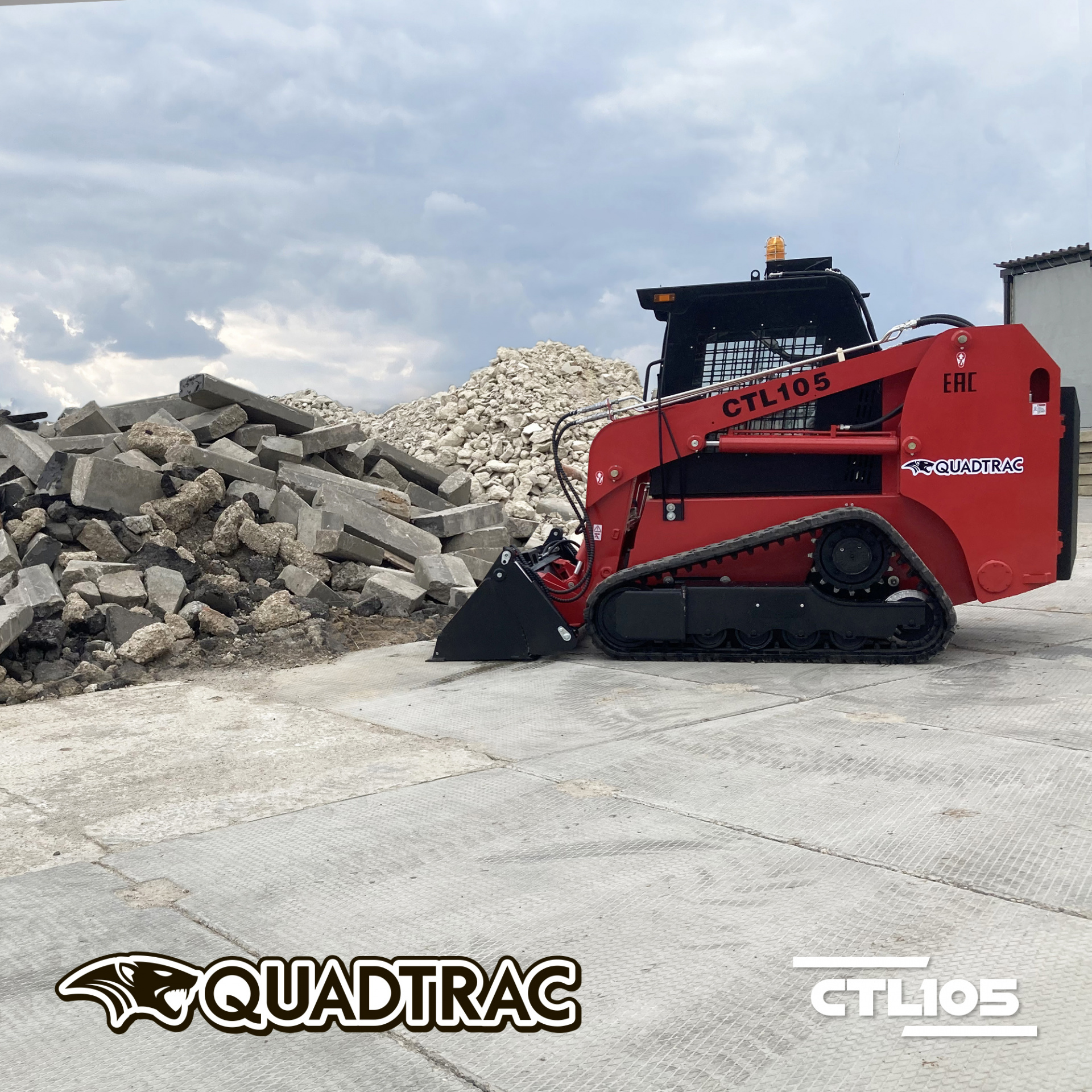 Погрузчик на гусеничном ходу QUADTRAC CTL105 имеет ряд преимуществ по отношению к колесным, так как может работать на неподготовленных площадках и рыхлых грунтах, обладая лучшей устойчивостью. При производстве техники QUADTRAC использованы инновационные технологии, профессионализм и опыт инженеров компании. Гусеничные мини погрузчики CTL105 имеют премиальную комплектацию, имея в базе все то, что у конкурирующих машин надо доплачивать: гидравлическая система высокой производительности HI-Flow , 2-х скоростные гидромоторы, кондиционер. Грузоподъемность 1050 кг и максимальная скорость 18 км/ч позволяют эффективно работать погрузчику на различных объектах. Электрогидравлические джойстики управления погрузчика делает его простым в использовании, гарантируя эффективность и в значительной степени способствуют снижению утомляемости оператора. Правый джойстик погрузчика управляет движениями рукояти и ковша; левый управляет движением.