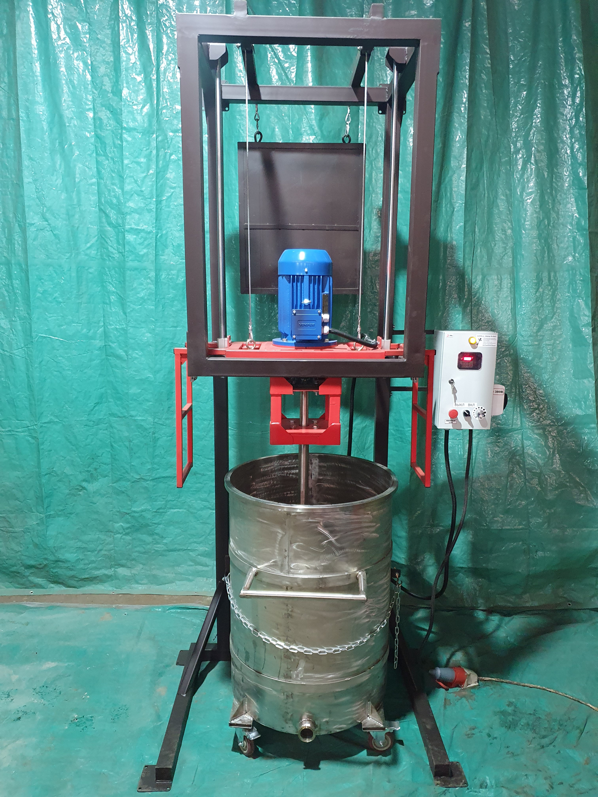 Промышленный производственный комплекс сложного перемешивающего оборудования компании @QuickMix представляет Вам продукцию: Диссольвер 4 кВт с подъемным механизмом и подкатной нержавеющей дежой на 200 литров в общепромышленном исполнении.