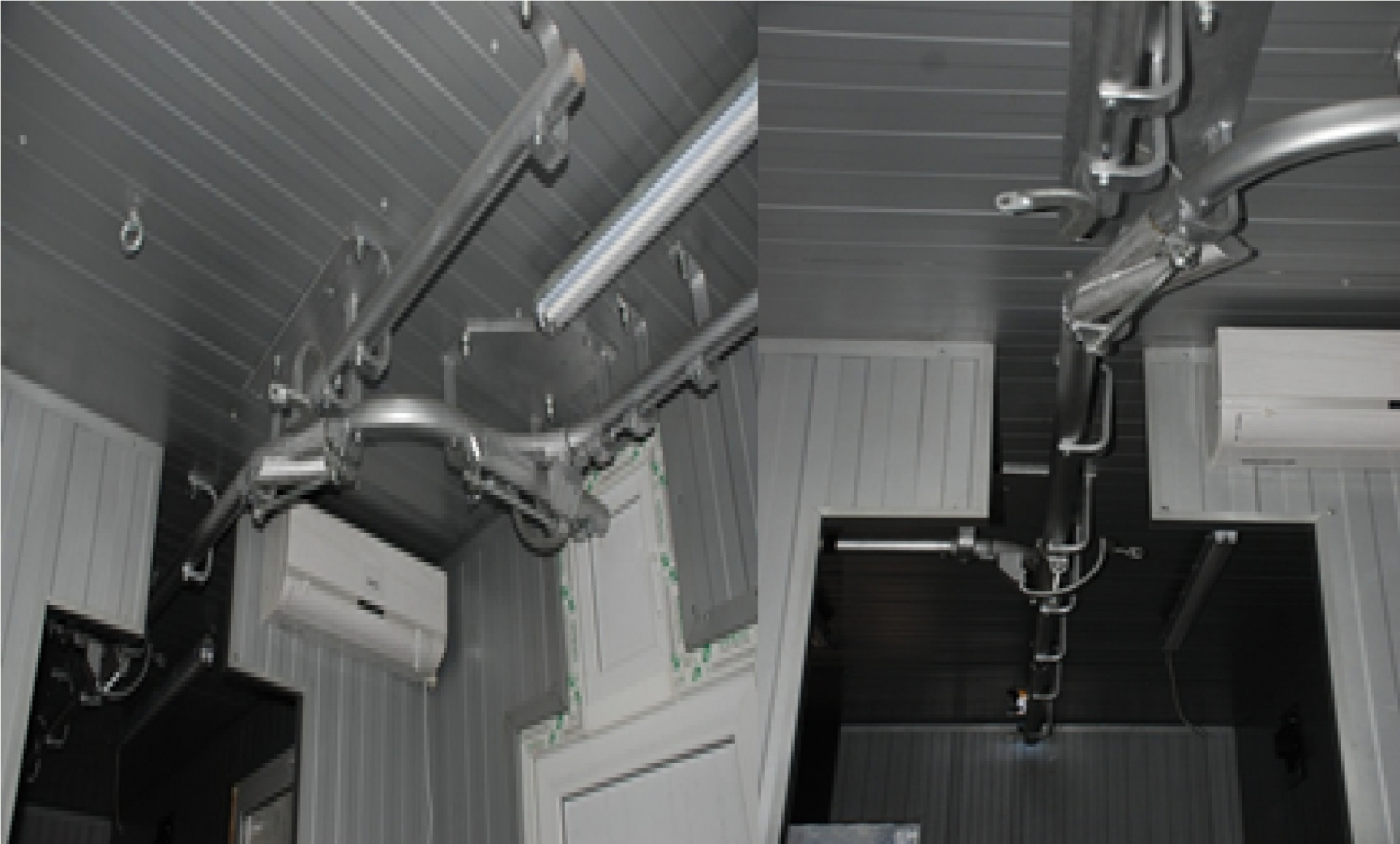 Перемещение туши с одной позиции на другую в пределах модуля производится с помощью подвесного пути.