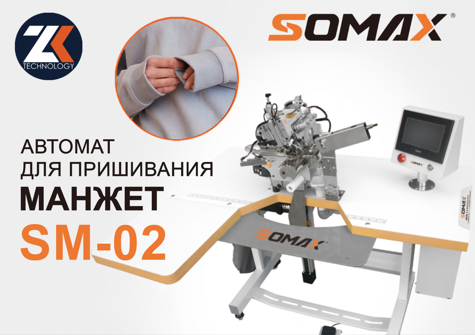 Полностью автоматическая программируемая швейная машина оверлок для пришивания манжет рукава и штанин при производстве трикотажным спортивных костюмов, толстовок, свитшотов, брюк и тд.