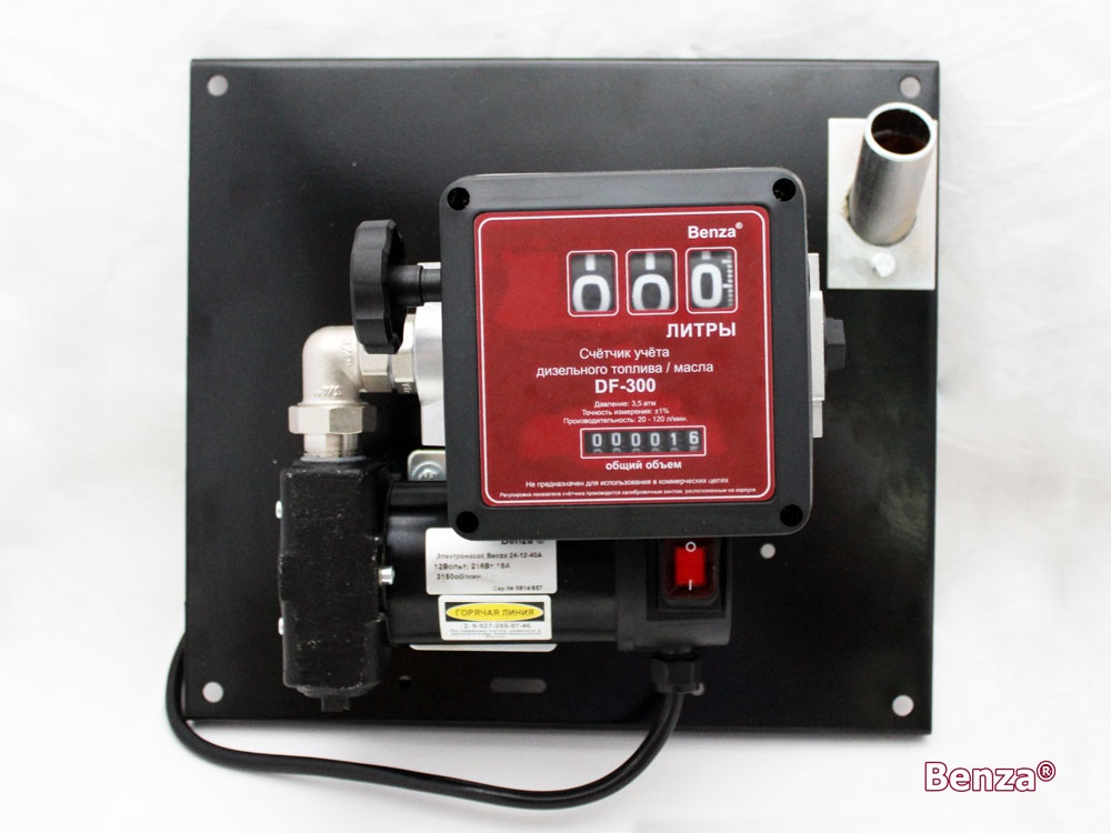 Мини АЗС марки Benza 24 предназначена для перекачки дизтоплива. Устанавливается вертикальной поверхности и работает от источника питания 12 В. Это позволяет осуществлять заправку транспортных средств топливом, в любом удаленном от города месте. Производительность насоса, в зависимости от модели, варьируется от 40 до 80 литров в минуту, мощность от 270 до 350 Вт.