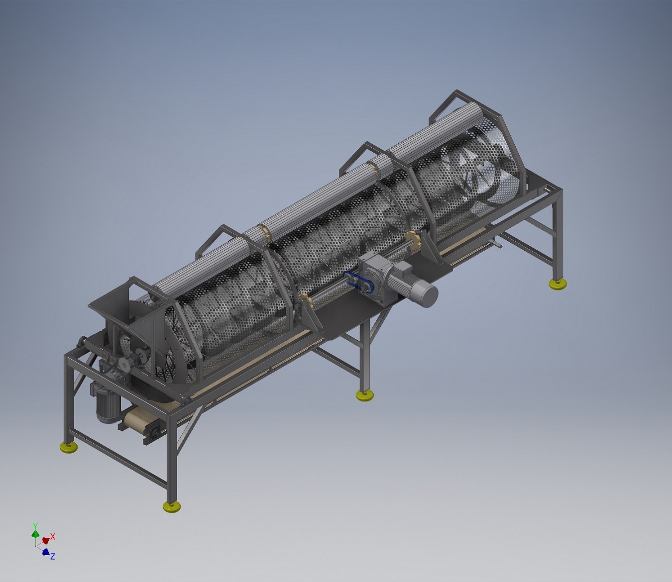 Предоставляем Вашему вниманию сепаратор для удаления косточек из жмыха винограда и других схожих продуктов. Продукт перерабатывается в сухом виде, влажность до 50%. На машине отбираются крупные частицы кожицы и кусочки стеблей, а косточки (семена) и мелкие частицы просеиваются через отверстия барабана и поступают на транспортер, установленный в нижней части машины.