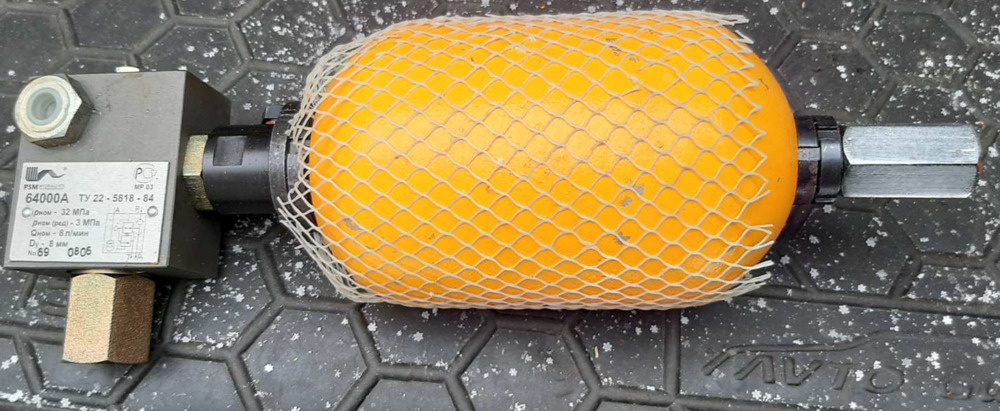 Пневмогідроакумулятор із гідроклапанами 64000 А призначений для живлення від гідролінії високого тиску систем дистанційного керування золотниками гідророзподільників у гідросистемах будівельних, дорожніх та комунальних машин.
