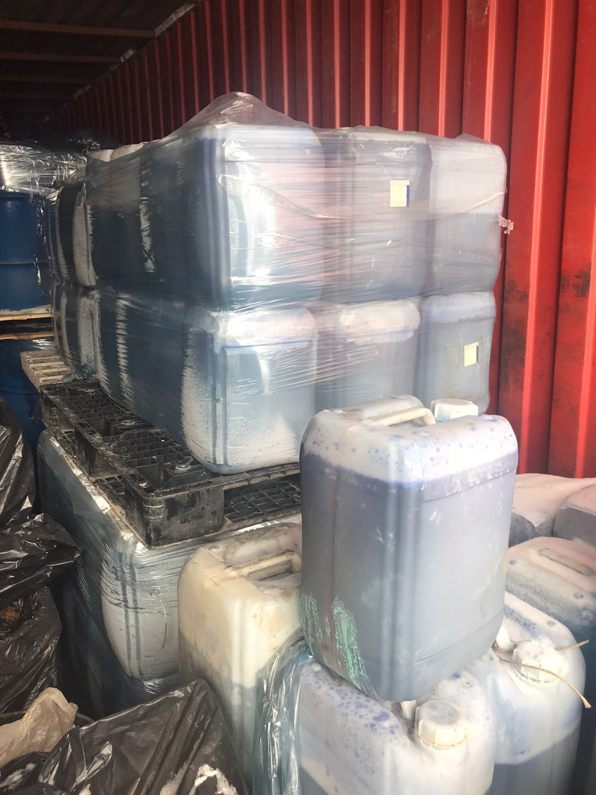 Жидкость синего (возможно с зеленым оттенком) цвета, с небольшим осадком. Фасована в канистры.