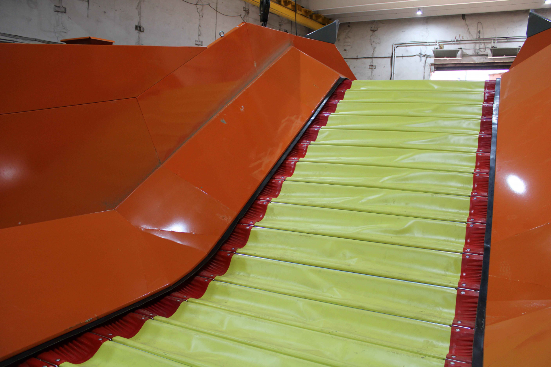 Во-первых, форма донного транспортёра "S" образная, что позволяет принимать овощи с самосвала и разгружать машины за 7-10 минут по сравнению с бункерами с прямоугольнойй формой ковша (В них разгрузка самосвала осуществляется за 20 минут).