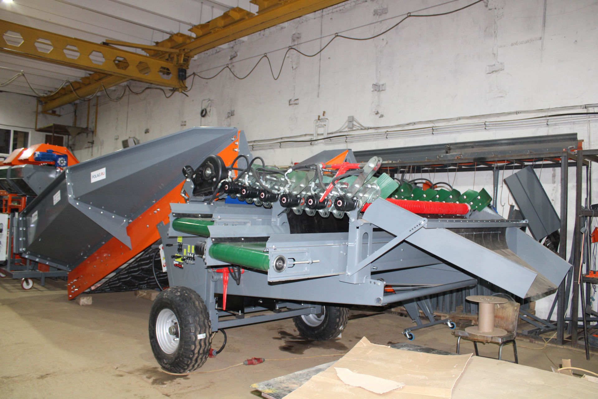 Бункер приемный сортировочный БПС-1640 с дополнительным сортировочным модулем имеет 12 валов шириной 1600 мм и 2 отводящих транспортера, что позволяет принимать и сортировать на 3 фракции с производительностью 30 тонн в час. Тем самым БПС-1640 можно использовать и для приёмки урожая во время уборки, и в линии предпродажной подготовки и фасовки.