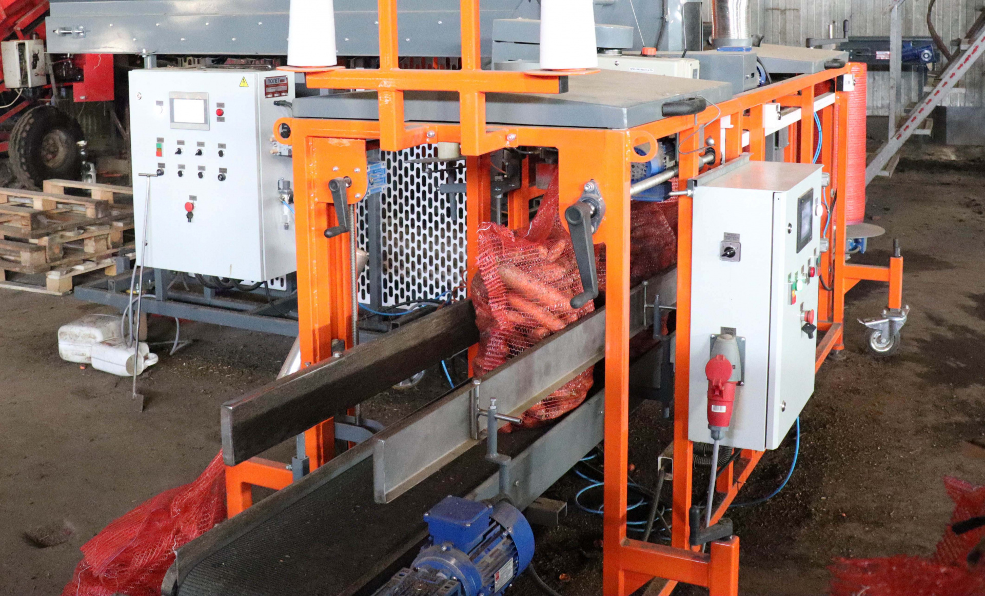 Упаковочная машина предназначена для фасовки овощей в сетку на рулоне: картофеля, лука, свеклы, моркови от 2 до 25 кг.