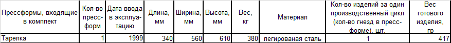 | Прессформы, входящие в комплект | Кол-во пресс- форм | Дата ввода в эксплуа-тацию | Длина, мм | Ширина, мм | Высота, мм | Вес, кг | Материал | Кол-во изделий за один производственный цикл (кол-во гнезд в пресс-форме), шт. | Вес готового изделия, гр |